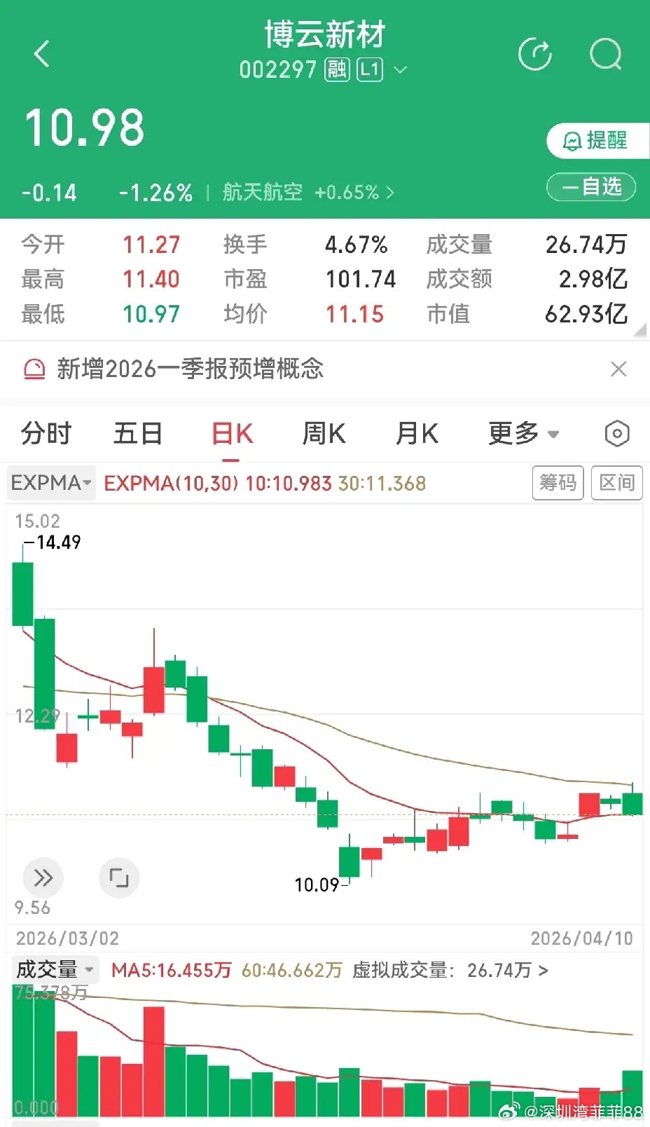 奇怪,博云新材,业绩大幅度增长,股价却不涨。2026年一季度净利润同比增长了11294%—14348%,股价却是在大幅度下跌后,横躺着十几天了,一直没有什么起色。不过有一个地方看上去还不错,就是底部横盘整理,股价是逐渐抬高的,尽管幅度不大,总是没有继续下移,算是个优点。