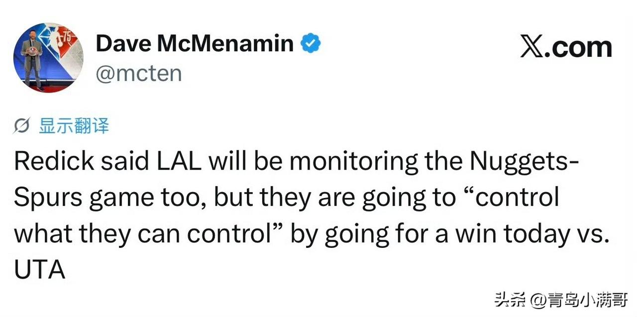 约基奇为本赛季奖项资格而战,预计也就出战20分钟,而湖人主教练雷迪克表示,他们将同步关注掘金马刺的比赛情况,但是也会做好自己能控制的事,那就是争取拿下爵士。