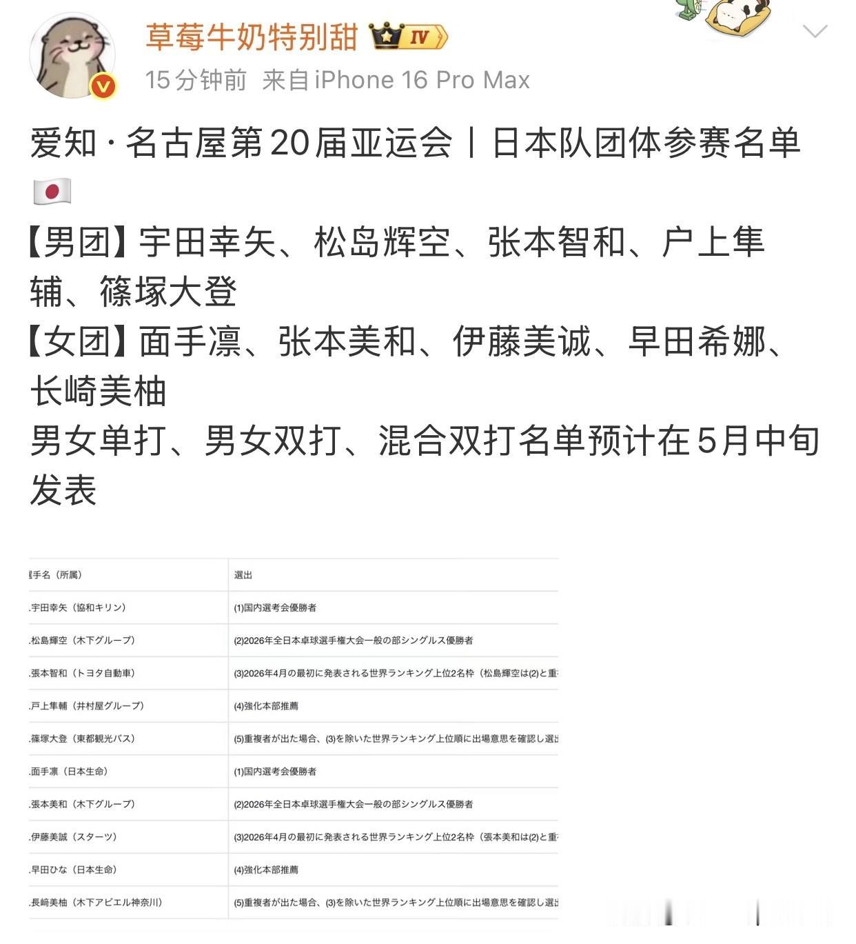 日本亚运会团体参赛名单已公布,女团还是有点出乎意料。 这是团体名单,单打和双打