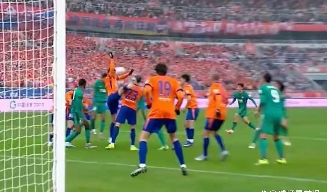 马德鲁加的手球,评议组评议:“泰山队8号球员手臂抬起,手臂位置使身体不自然扩大,冒了手球犯规风险,此情形下球接触手臂,应判8号手球犯规。”