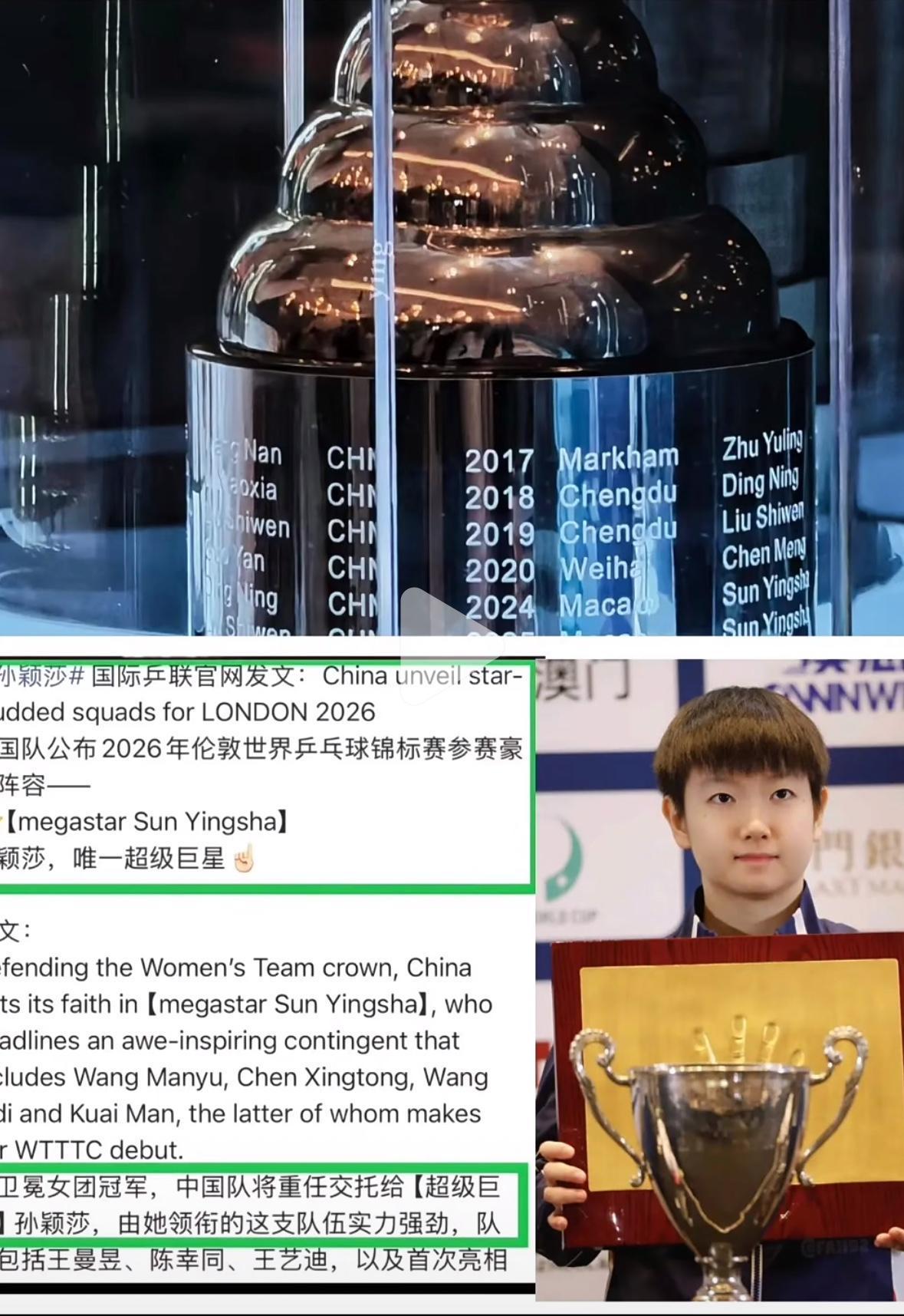 国际乒联官网发文认证:孙颖莎,唯一的超级巨星!