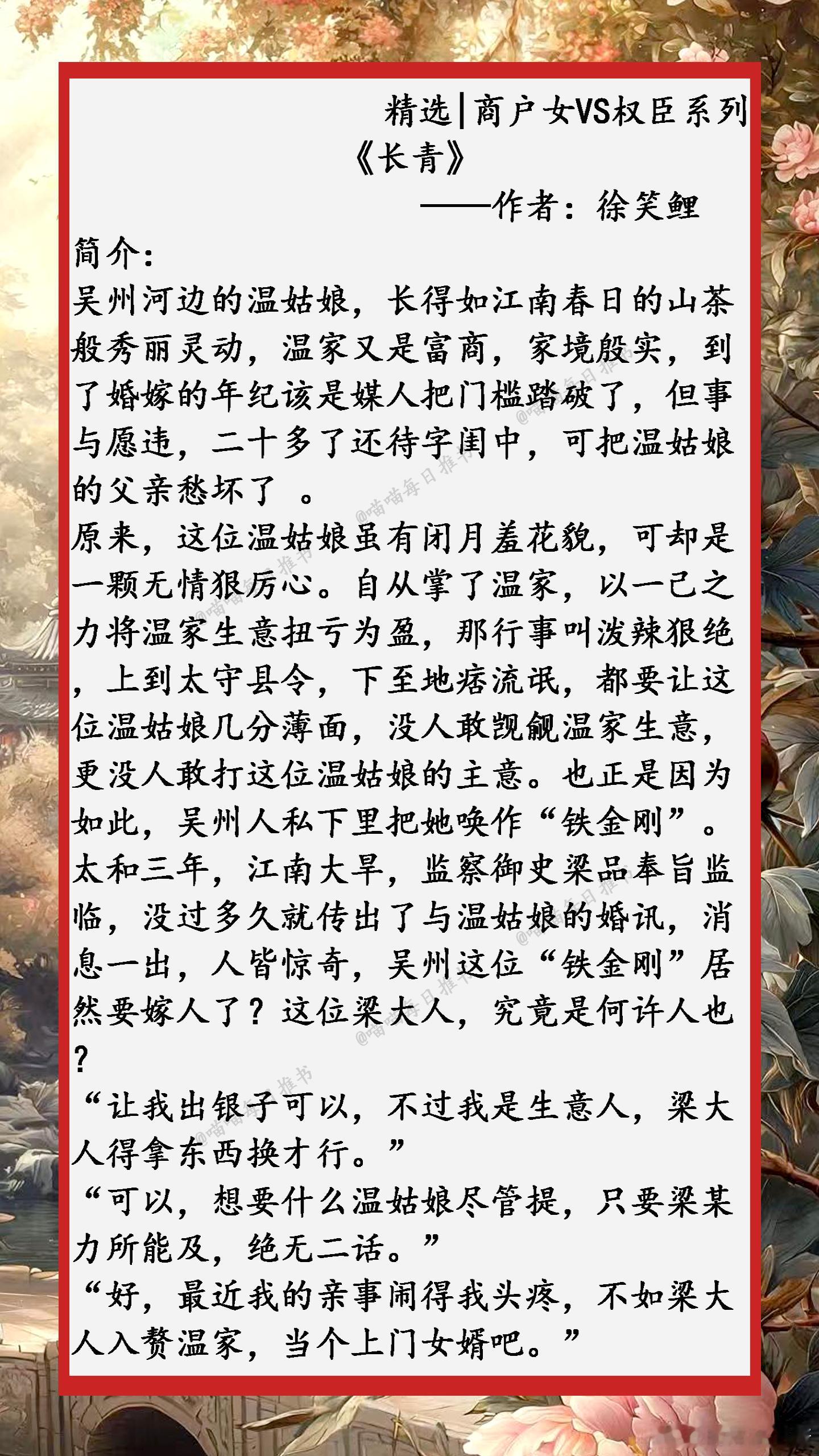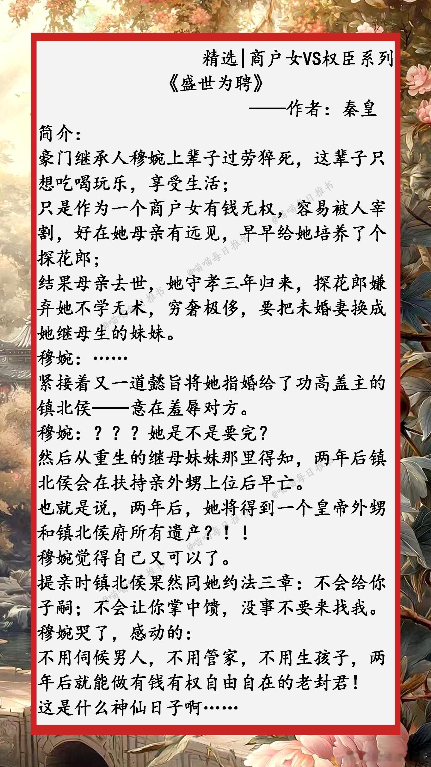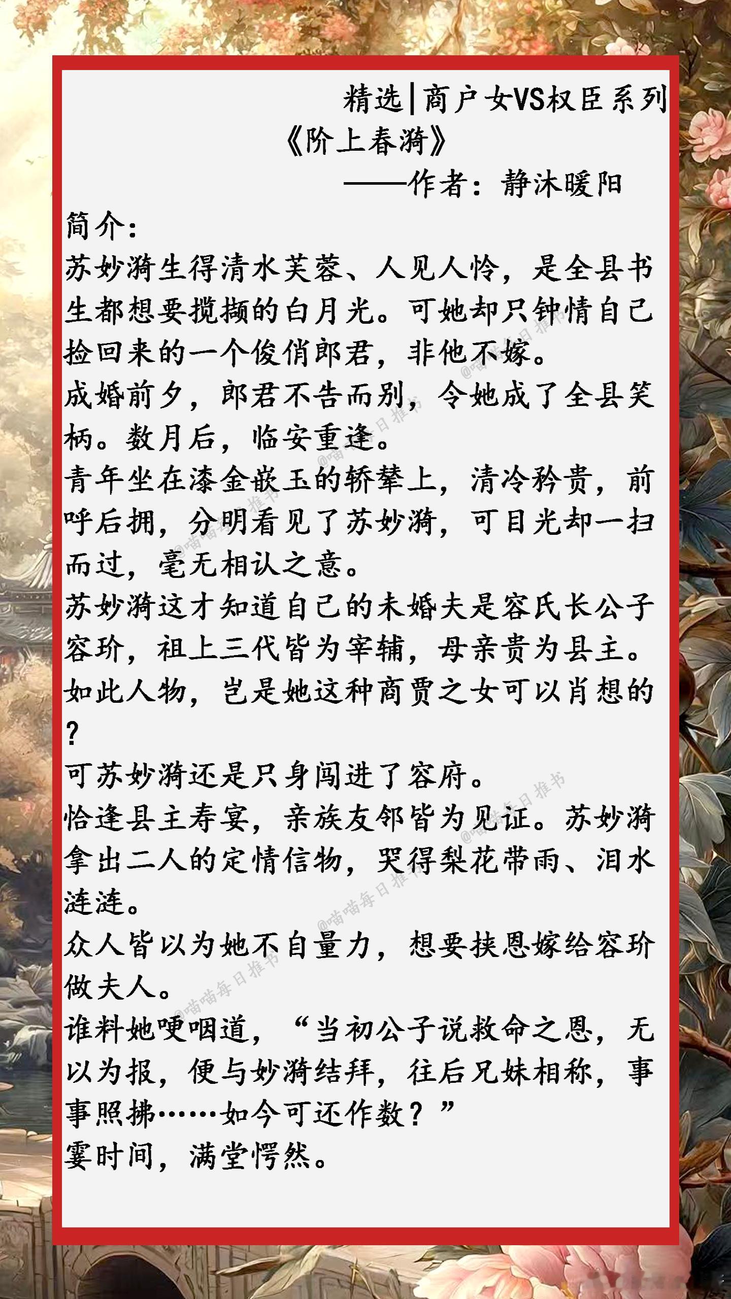 精选【商户女VS权臣】系列合集:疯了吗?不是,他只是心甘情愿.......好看的小说小说推文 1、《盛世为聘》——作者:秦皇2、《醉琼枝》——作者:狂上加狂3、《探花郎的极品二嫂》——作者:绿豆红汤4、《长青》——作者:徐笑鲤5、《非富即贵》——作者:起跃6、《二度春风》——作者:一颗绿毛球7、《丞相夫人是首富》——作者:臣音8、《娇术》——作者:宋三冬9、《阶上春漪》——作者:静沐暖阳