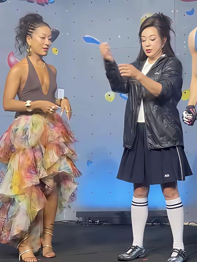 先说“刘姥姥”,她明明已是奶奶辈,身材发福,面容松弛,却非要扮成学生模样。那黑色运动外套搭配百褶裙,再配上白色长筒袜和复古运动鞋,这造型实在是不忍直视,违和感十足。