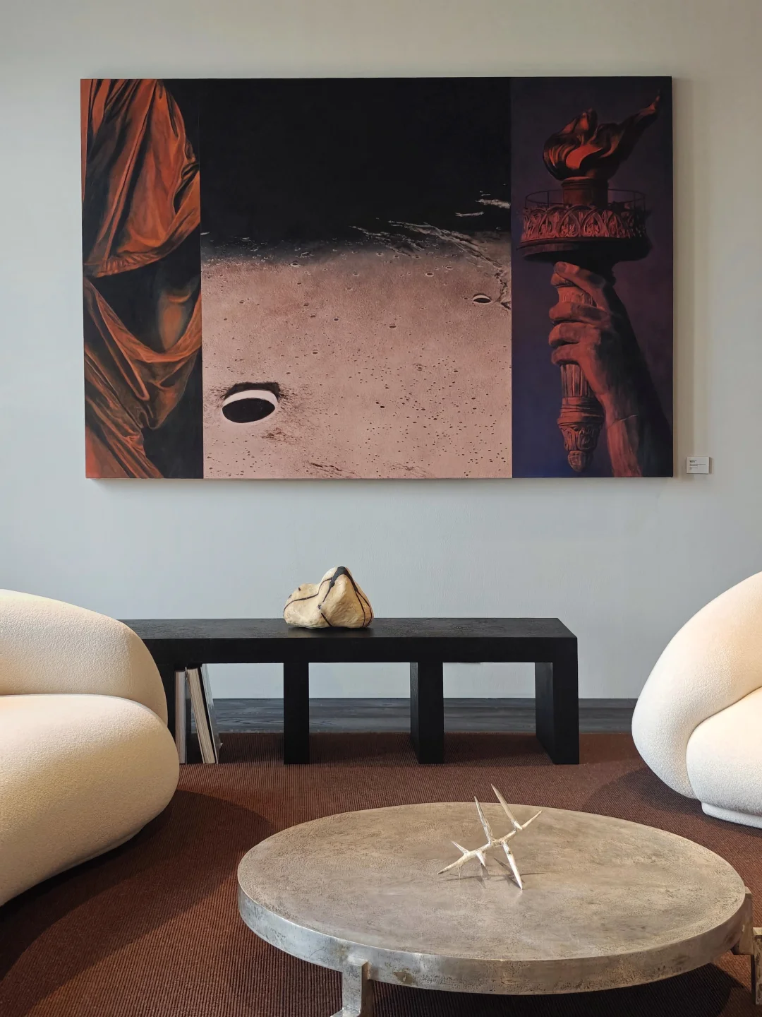 旅居巴黎,以克制笔触转化文明符号,横跨绘画与装置。在理性秩序与感性表达之间,构建深邃静谧的精神场域。