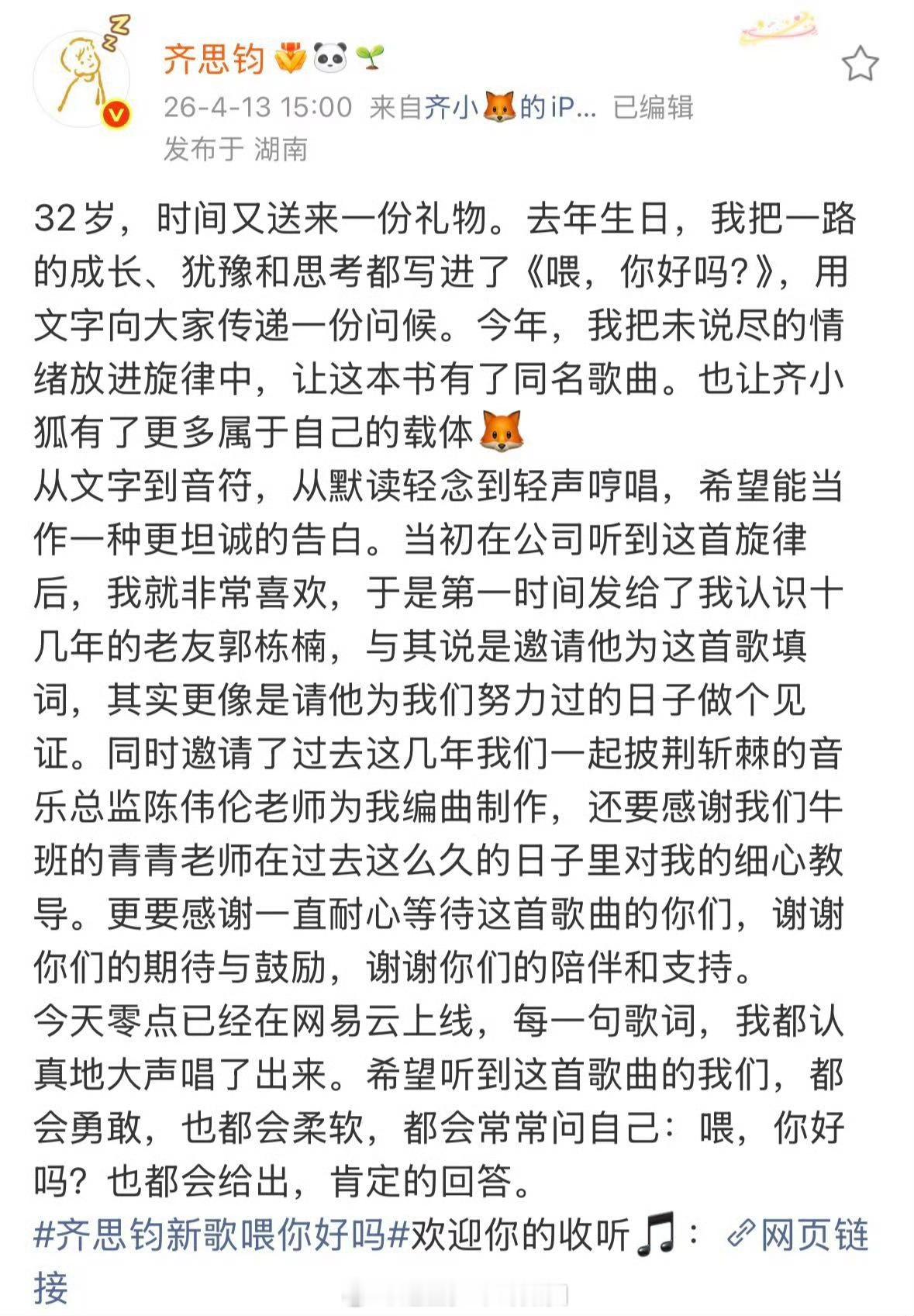 齐思钧生日兑现新歌约定 齐思钧说到做到的样子真的很帅。去年说会发歌,今年生日就准时上线。首支个人单曲,歌词真诚又好品,听完只想说一句:喂,我很好,你呢?期待晚上的生日直播。