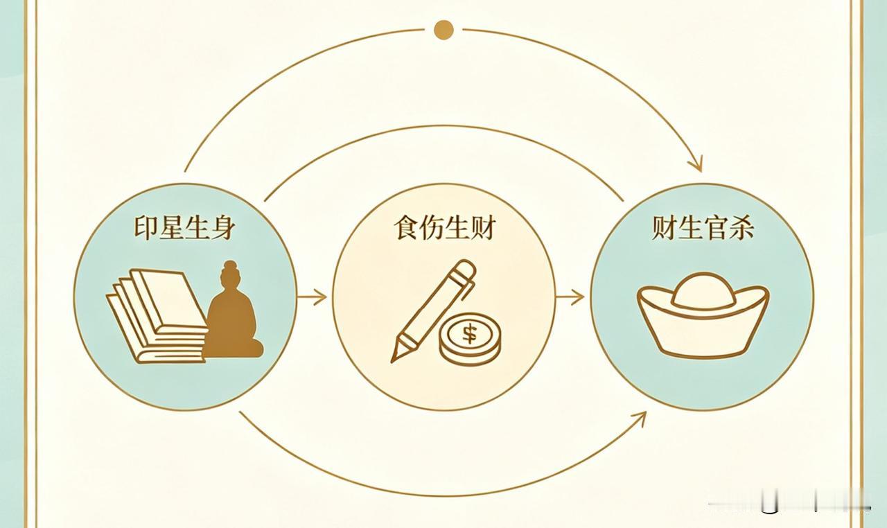 • 财生官杀:通过积累资源,提升自身地位与责任