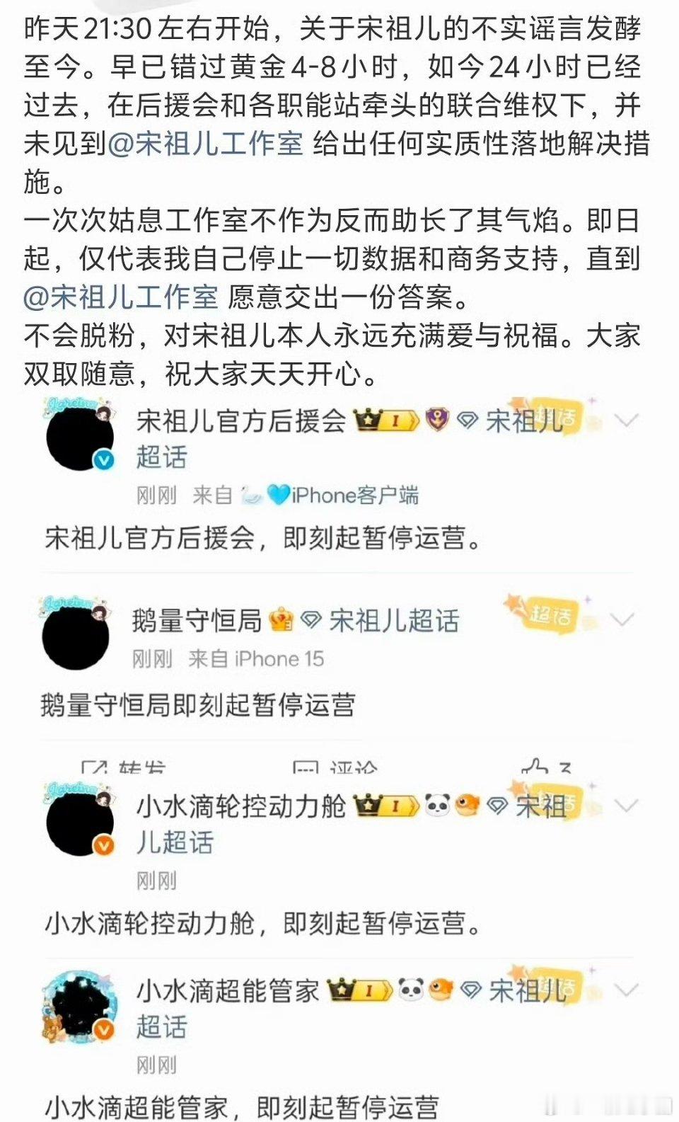 宋祖儿后援会暂停运营宋祖儿后援会和各个职能组黑头像并暂定运营,向工作室维权!!支持粉丝维权