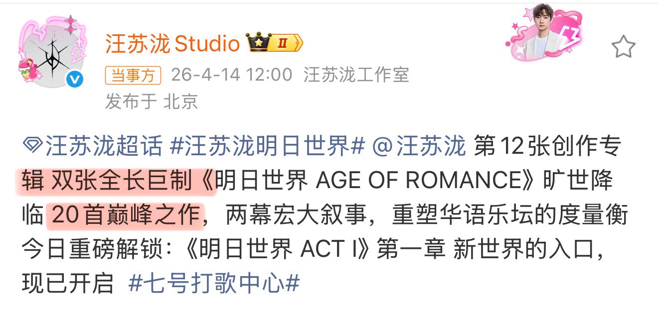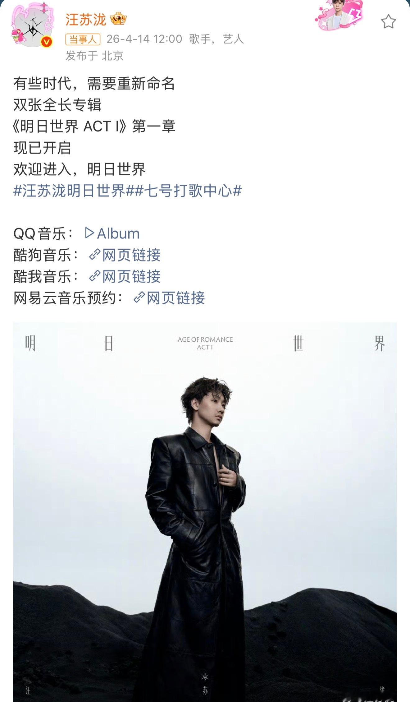 什么你说汪苏泷 《明日世界 ACT I》只是《明日世界 AGE OF ROMANCE》的第一章,just 入口?目前发布的五首歌只是第一章的前半程?所以明日世界是双专辑,分上下幕共有20首歌宏大叙事再次来袭,罗曼宇宙我来了汪苏泷新专辑有20首歌汪苏泷明日世界是双张专辑
