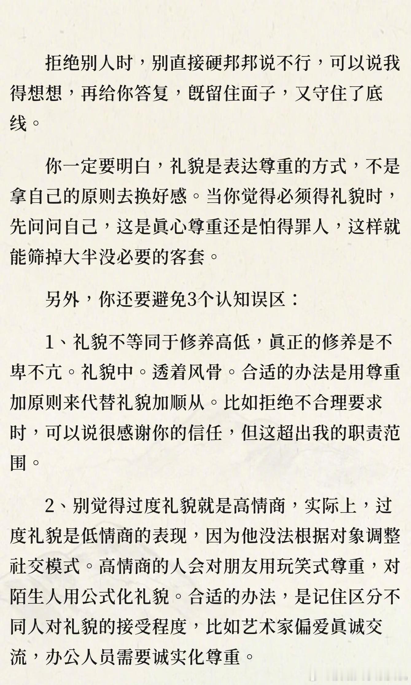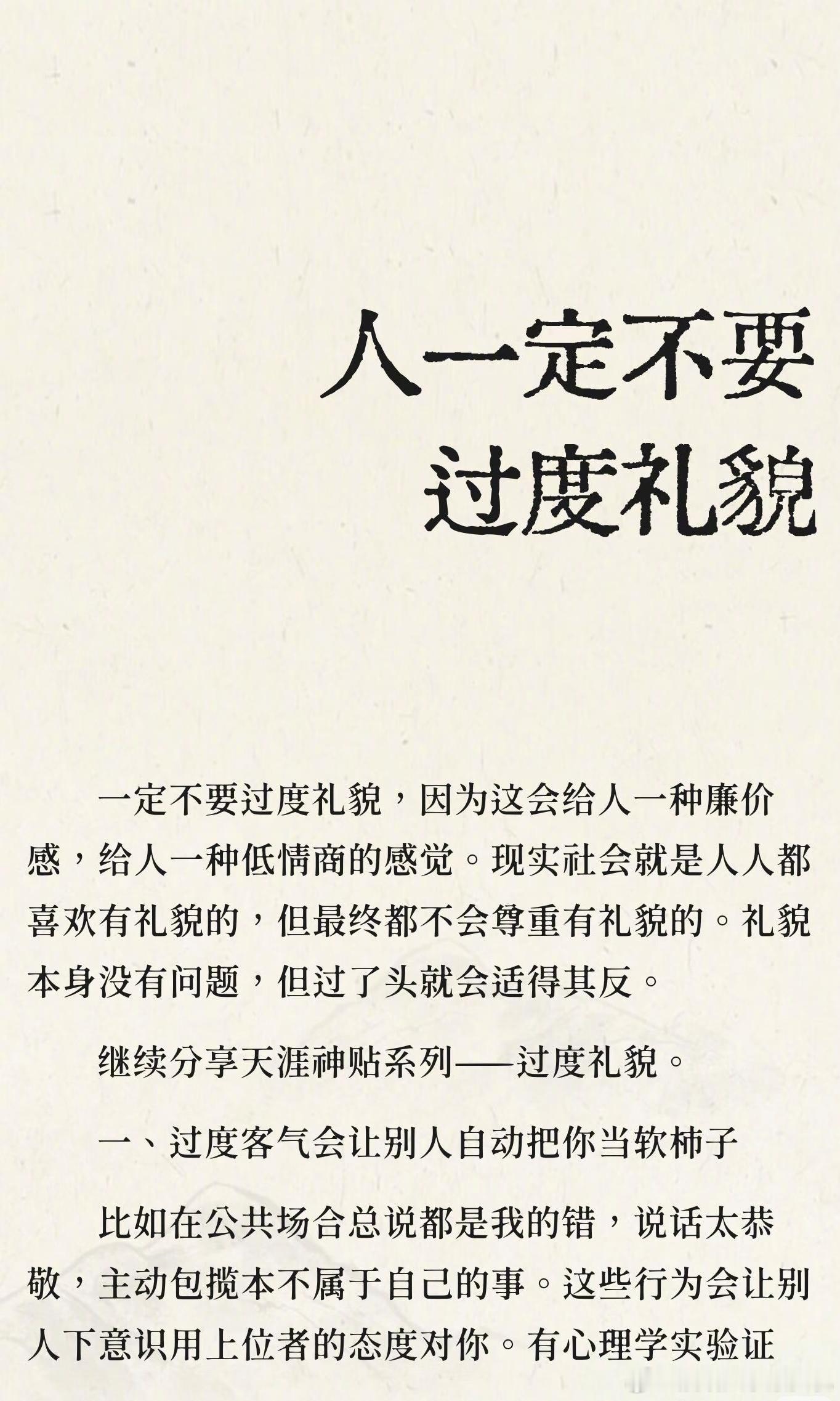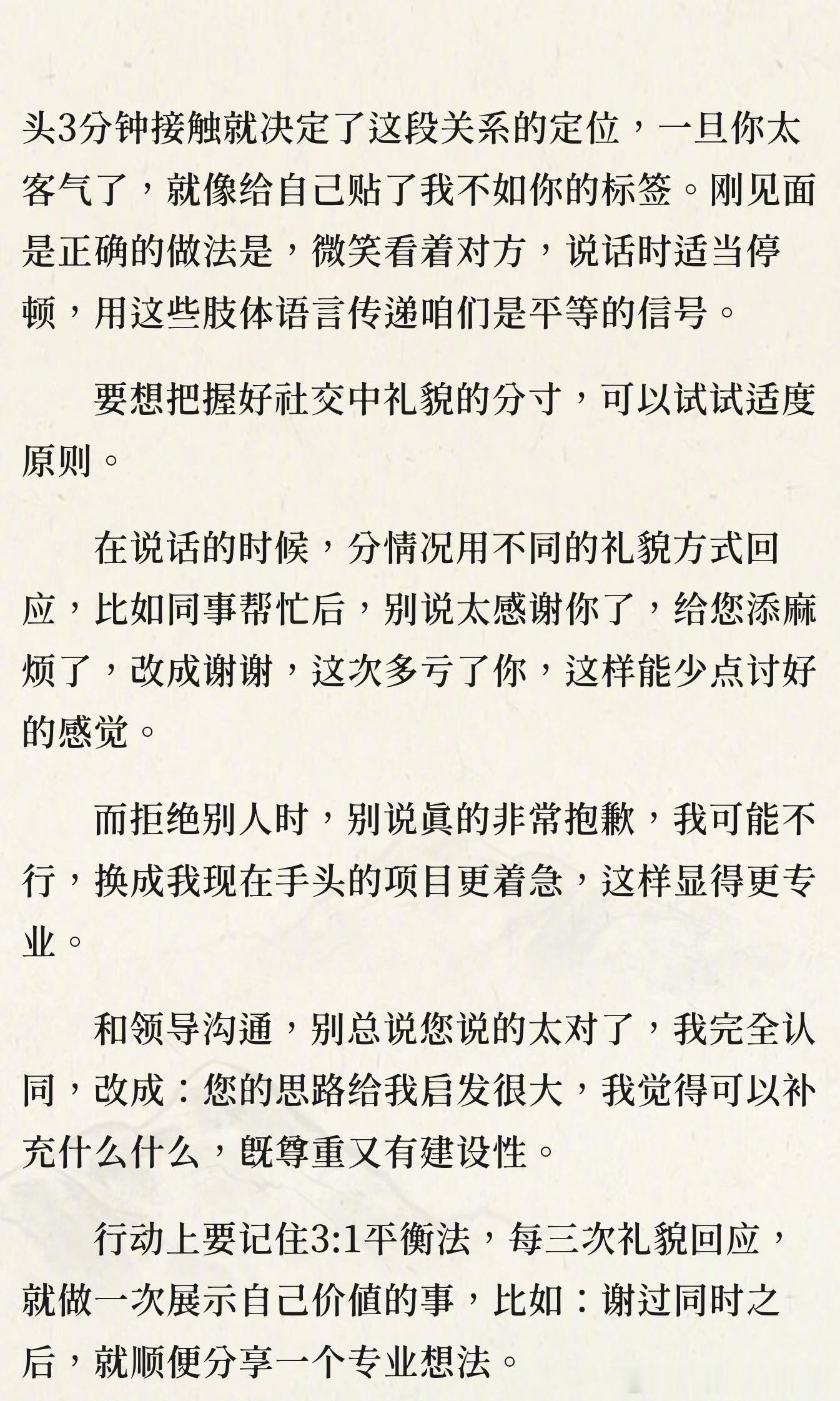 一定不要过度礼貌过度礼貌会让人误以为你软弱,掩盖真实能力,降低被重视的机会。正确