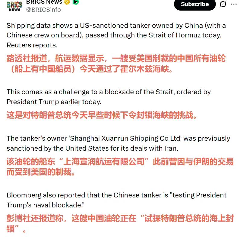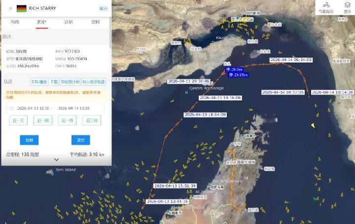 英国路透社报道称,一艘与东大有关联、被制裁的油轮“Rich Starry”号无视美国的封锁,在美国宣布的封锁时间到点之后依然从波斯湾前行,通过了霍尔木兹海峡。