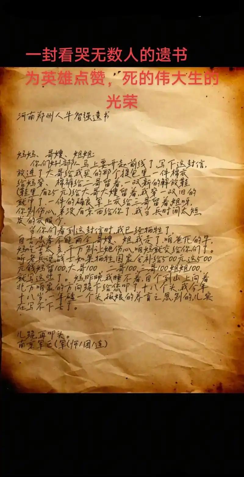 而那次写的请战遗书呢,由于怕父母担心,我从来没提过,后来一次在机关工作整理物品,我发觉留着也没用,就烧掉了。