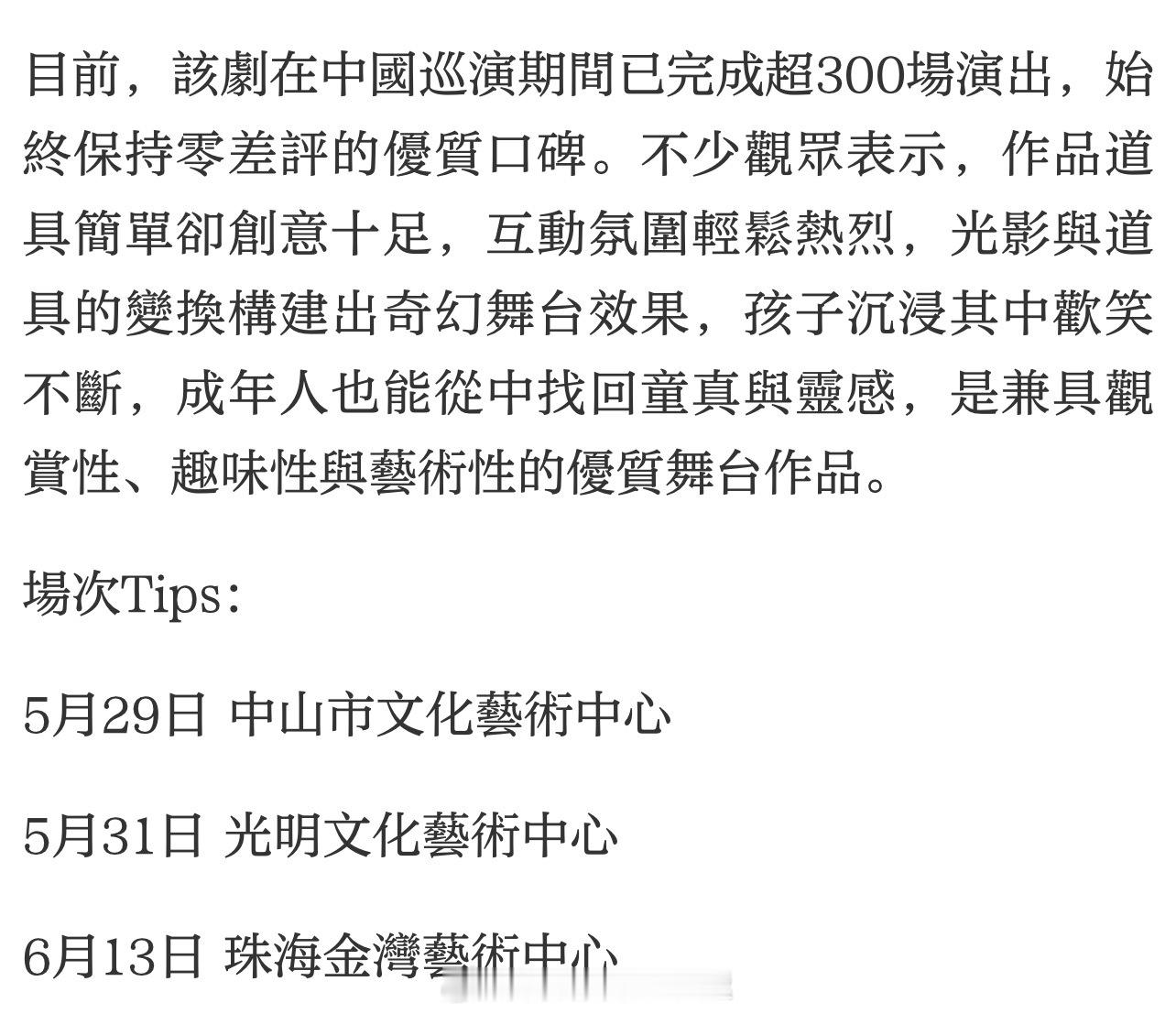 「乌克兰 國寶級喜劇《疯狂的废纸世界 》5月登陸大湾区 … (大公文匯網記者李薇)沒有一句台詞,僅憑一疊白紙、幾位演員與靈動肢體,便構築起充滿奇思妙想的喜劇世界。烏克蘭國寶級喜劇劇團MIMIRICHI代表作《瘋狂的廢紙世界》即將於5月登錄中山 、深圳 ,並在6月來到珠海 ,以極簡道具演繹極致歡樂與治癒,為全年齡段觀眾帶來一場打破語言邊界的想像力盛宴。《瘋狂的廢紙世界》由烏克蘭知名喜劇團體MIMIRICHI劇團創作《瘋狂的廢紙世界》由烏克蘭知名喜劇團體MIMIRICHI劇團創作,劇團自1989年成立以來,承襲卓別林、巴斯特·基頓、馬塞爾·馬索等大師的喜劇脈絡,將啞劇、肢體表演、即興互動與節奏音效巧妙融合,形成獨樹一幟的表演風格,成為國際舞台上極具代表性的喜劇團隊之一..」入內看全文:网页链接 即时娱乐新闻 娱乐圈 电影 电视 音乐 喜剧 .…. 香港