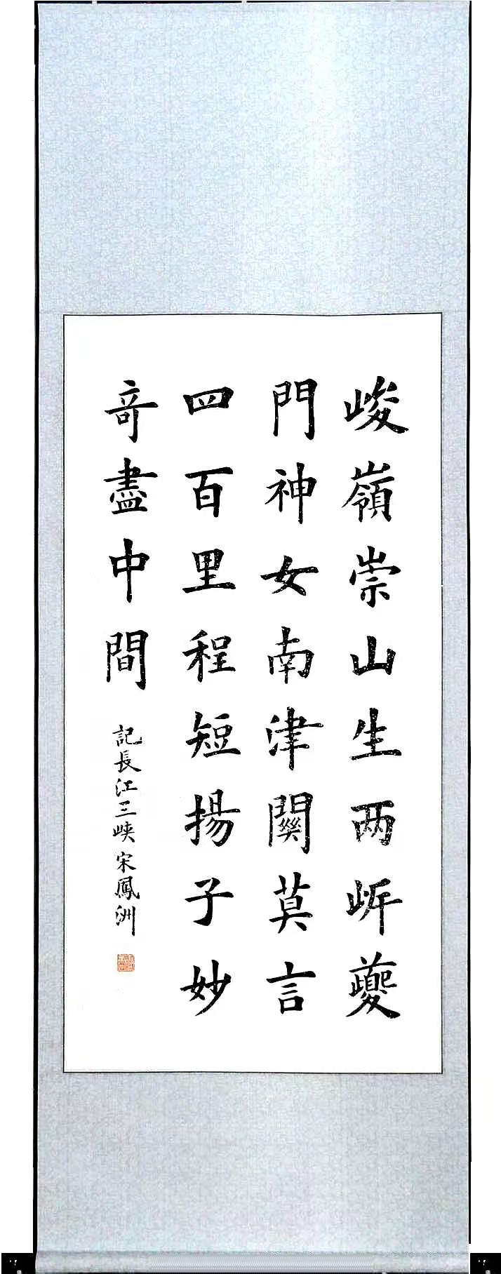 两张中堂(已裱)。宋凤洲书法作品:书唐代.张继《枫桥夜泊》诗(三尺行书中堂);自作诗:《记长江三峡》(四尺楷书中堂)。宋 诗书 中堂