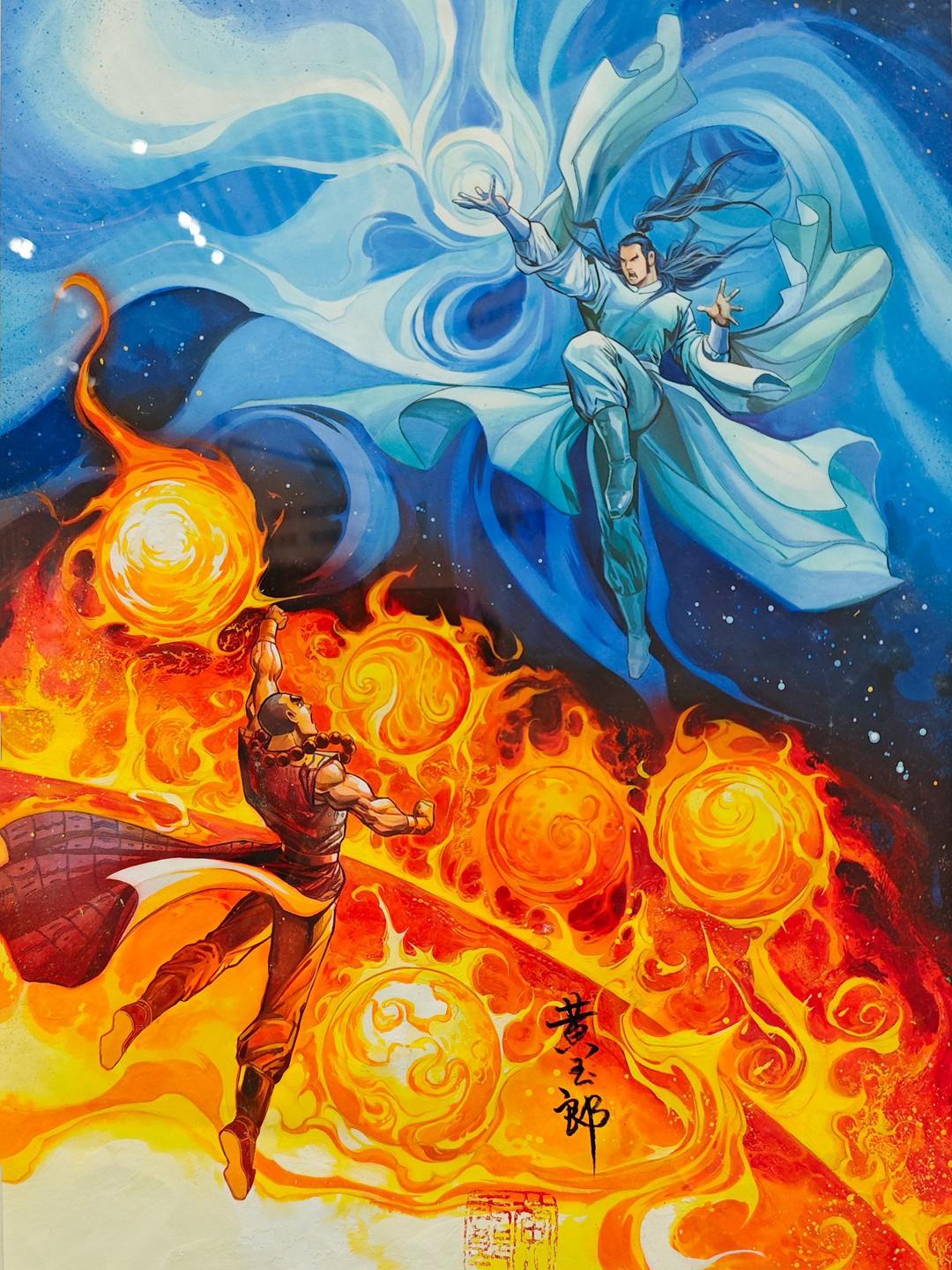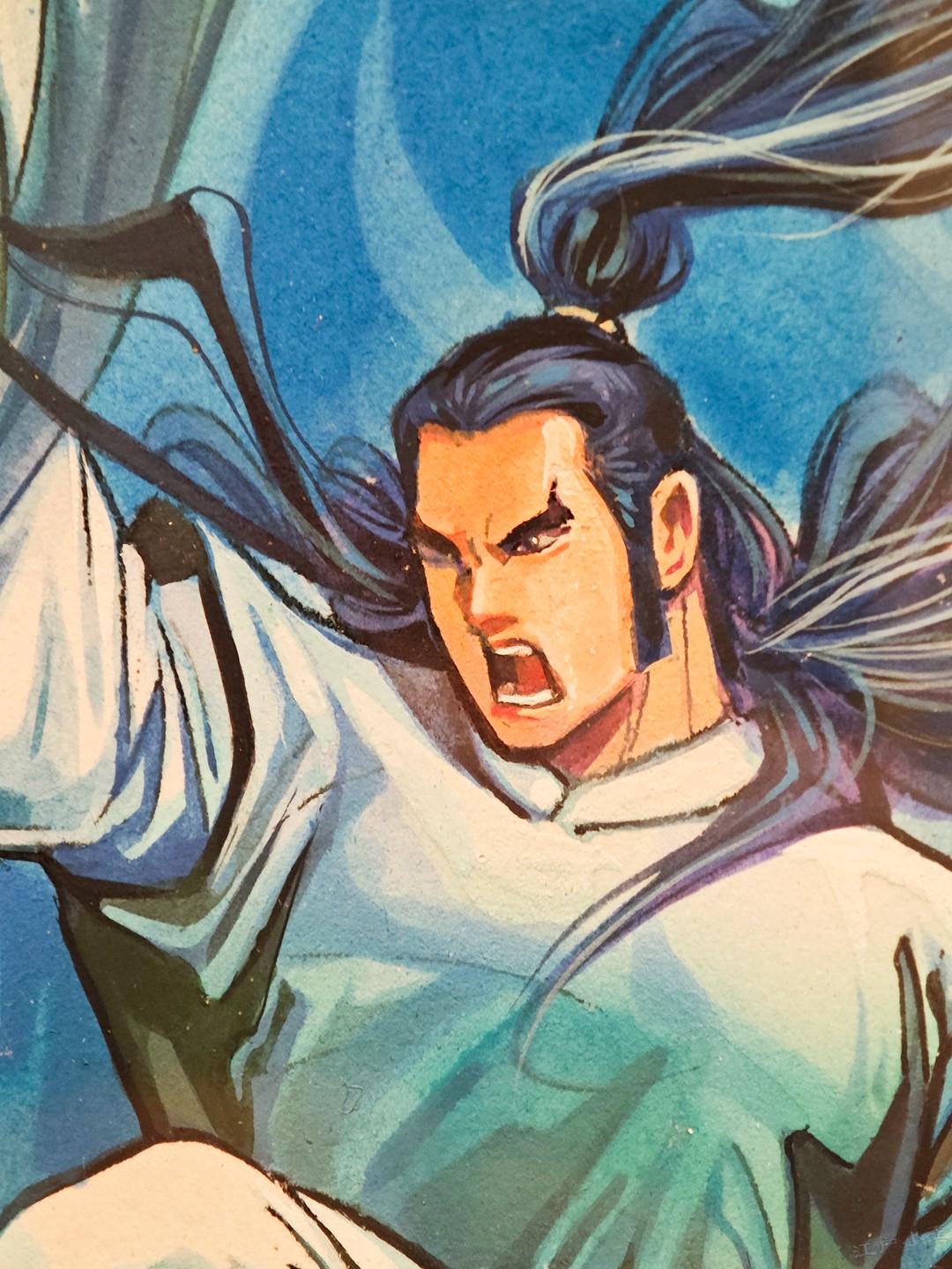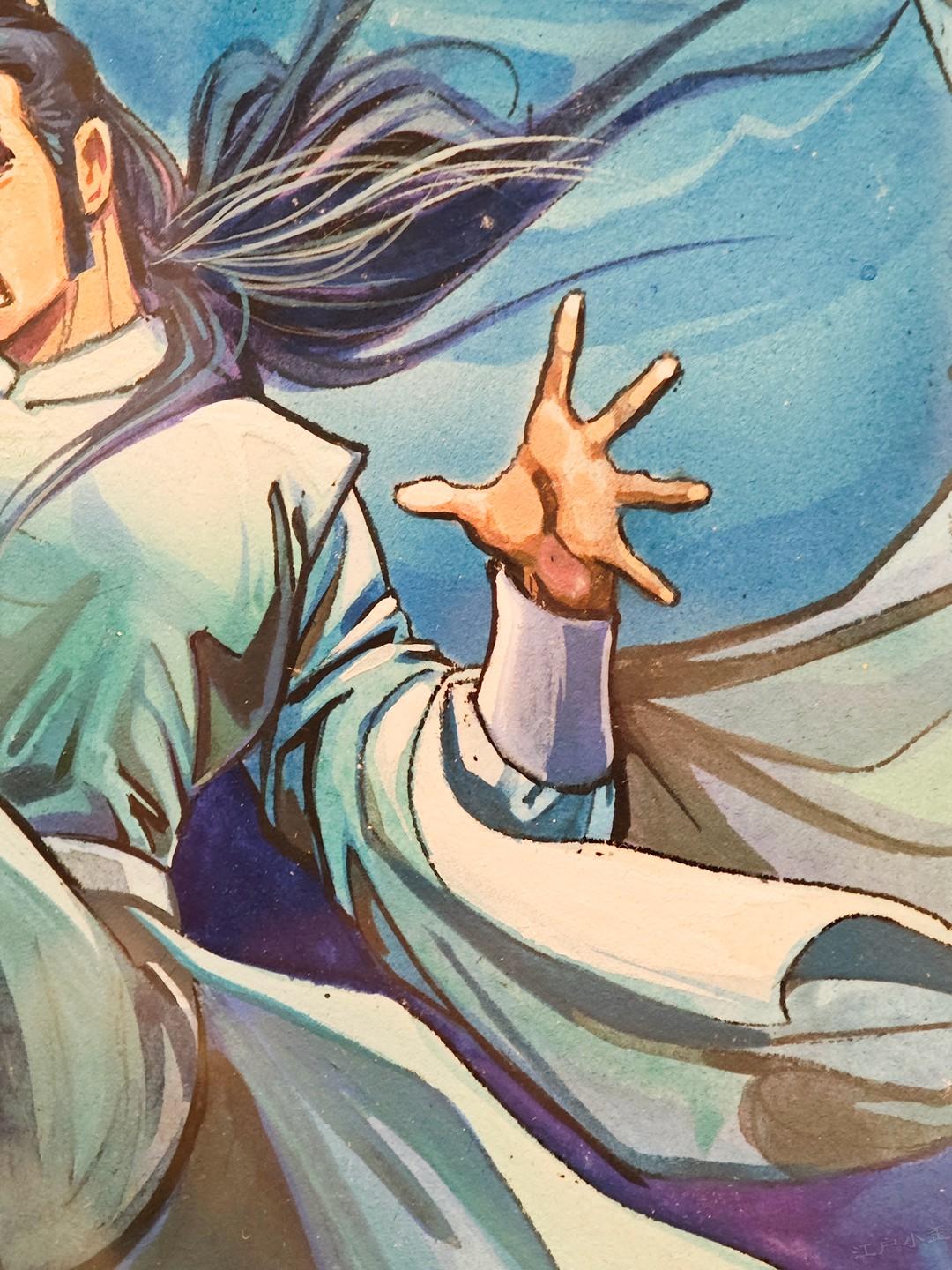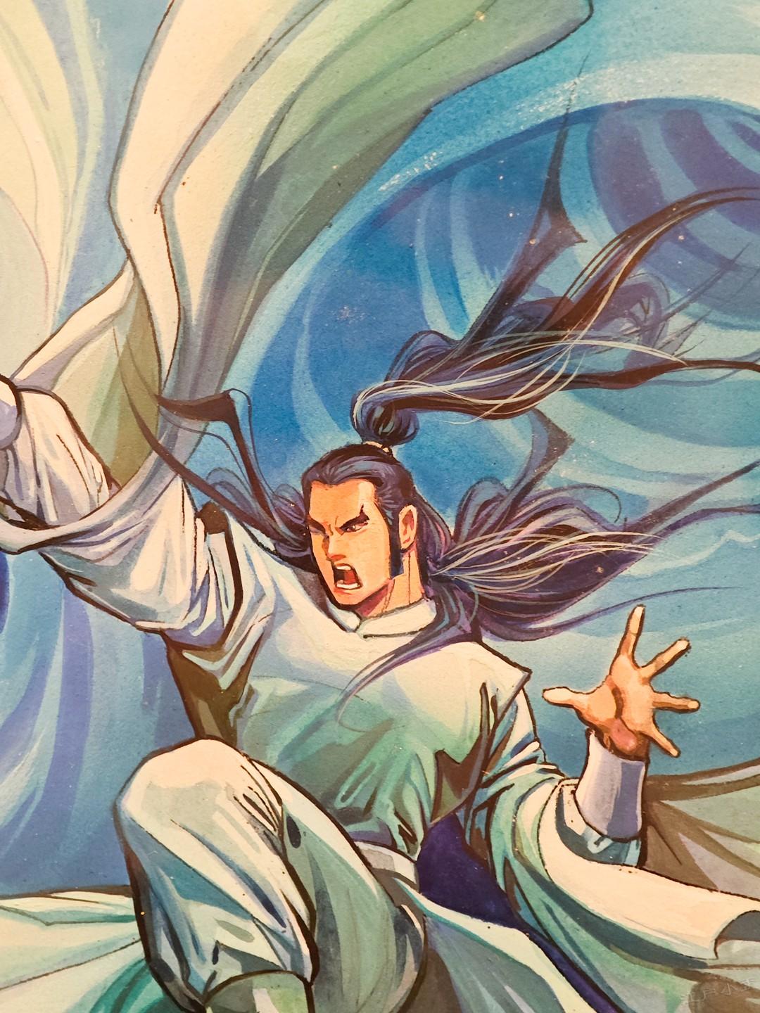 这幅是天龙八部故事第61回《六阳对星移》的封面,香港漫画家黄玉郎绘制,近日我摄于广州美术馆,尺寸44*32cm。小时候我还收集过这套小虎队食品卡,很喜欢天龙八部漫画的造型,还有一些明暗的处理以及色彩表现,这次在广州美术馆看到,感到非常震撼。 只见二位高手对峙,虚竹施展出绝学天山六阳掌(不知为何握拳),好像是站在烈日之上,而慕容复临空飞起,手中聚气,正是他的拿手好戏——斗转星移。整个画面冷暖色对轰,气势浩大,构思奇幻,壮怀激烈。稿子上还能看到画稿上水粉、丙烯的笔触。