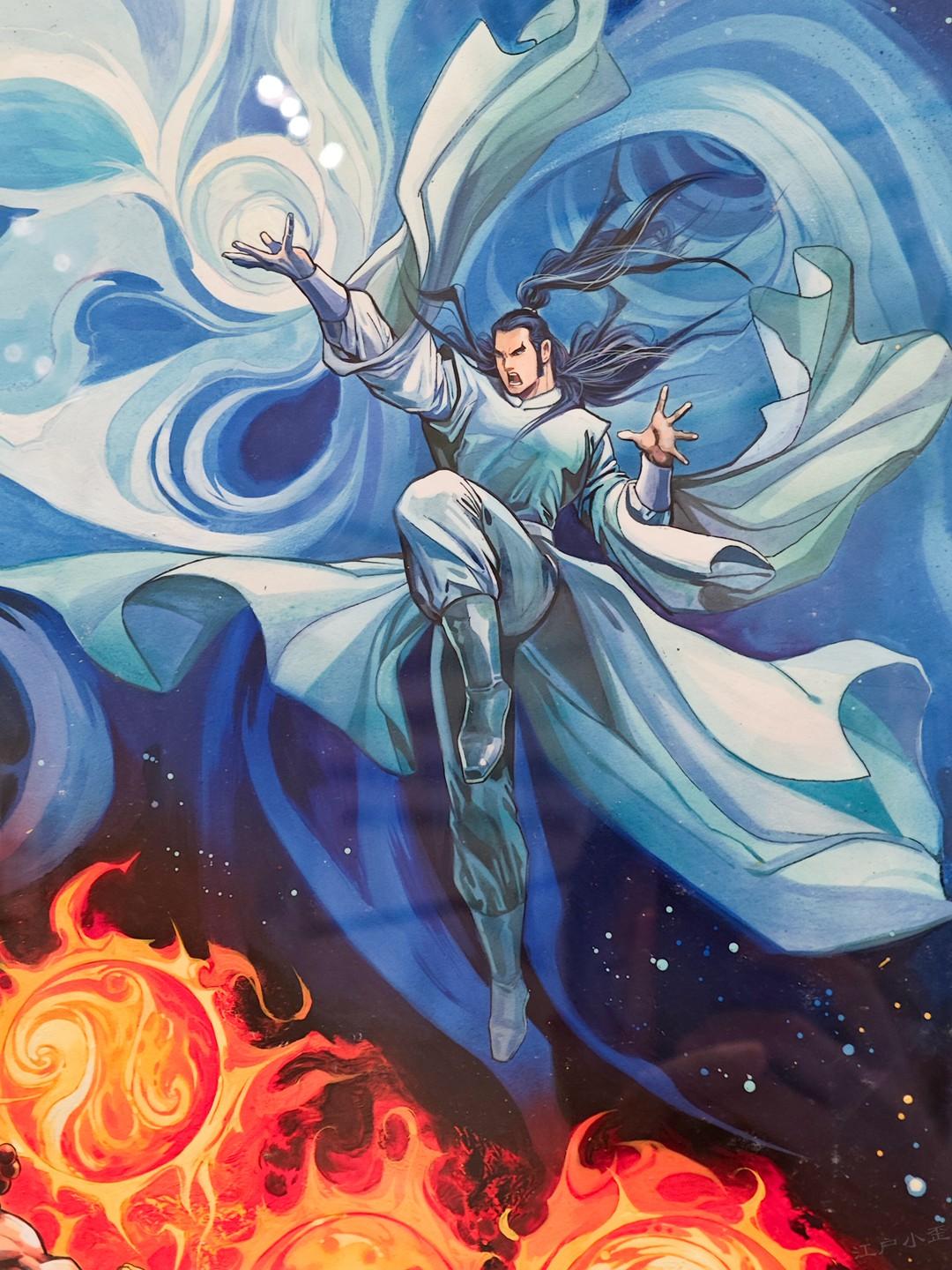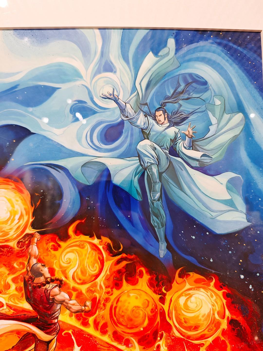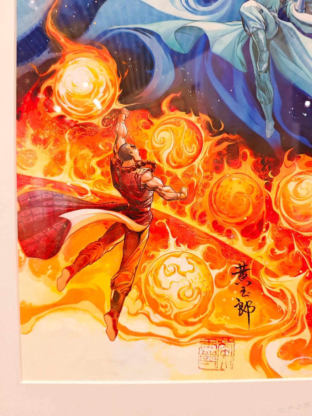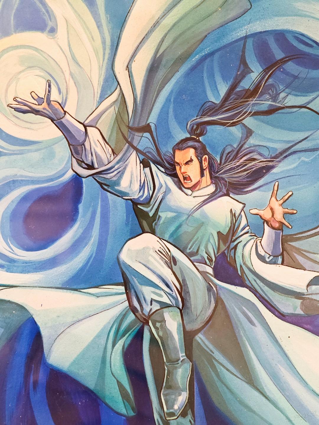 这幅是天龙八部故事第61回《六阳对星移》的封面,香港漫画家黄玉郎绘制,近日我摄于广州美术馆,尺寸44*32cm。小时候我还收集过这套小虎队食品卡,很喜欢天龙八部漫画的造型,还有一些明暗的处理以及色彩表现,这次在广州美术馆看到,感到非常震撼。 只见二位高手对峙,虚竹施展出绝学天山六阳掌(不知为何握拳),好像是站在烈日之上,而慕容复临空飞起,手中聚气,正是他的拿手好戏——斗转星移。整个画面冷暖色对轰,气势浩大,构思奇幻,壮怀激烈。稿子上还能看到画稿上水粉、丙烯的笔触。