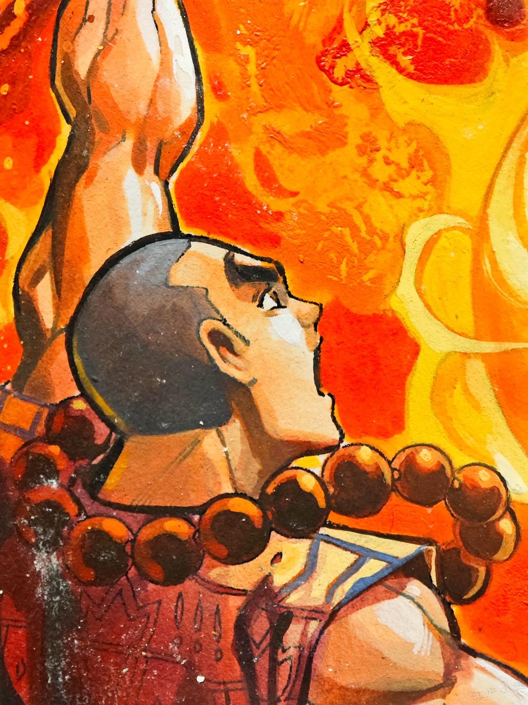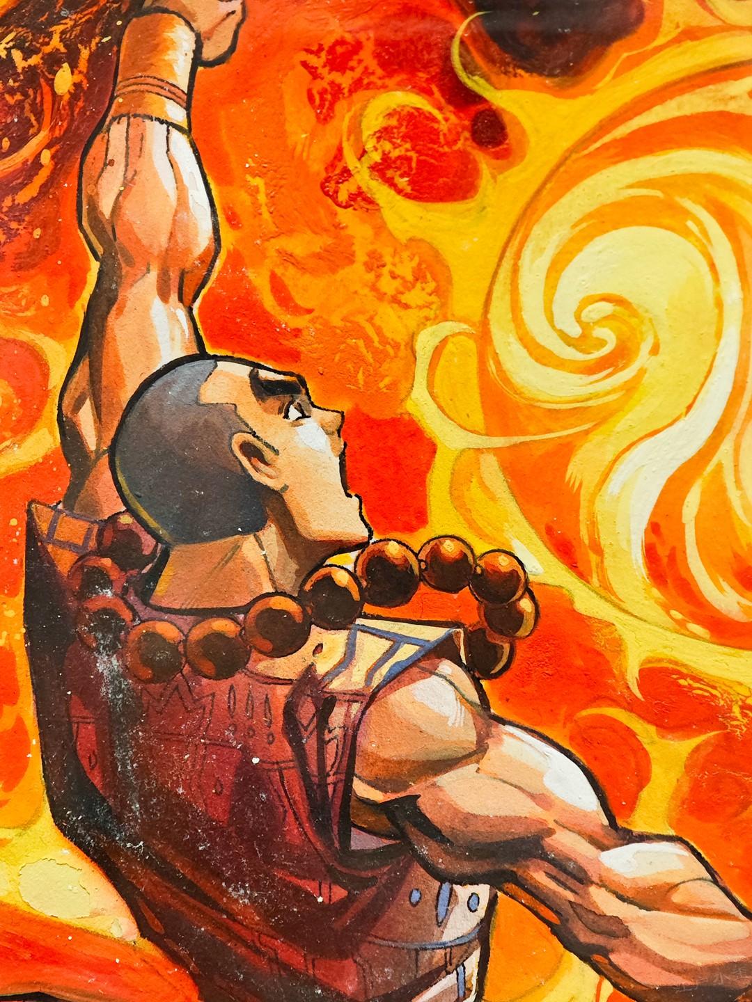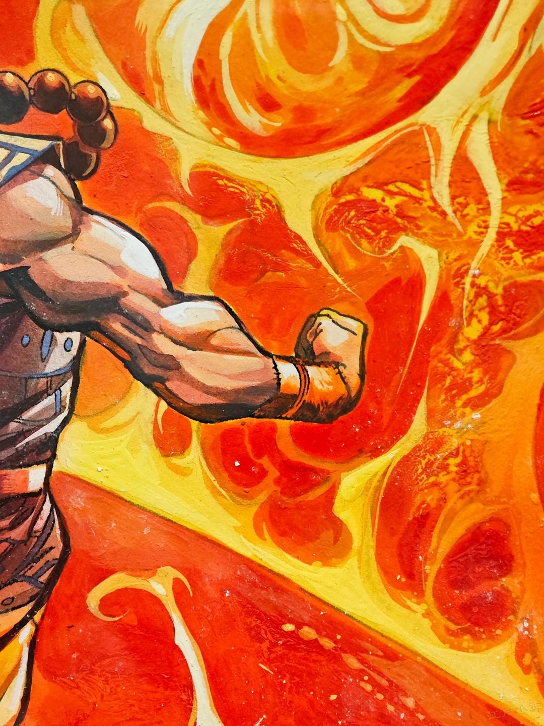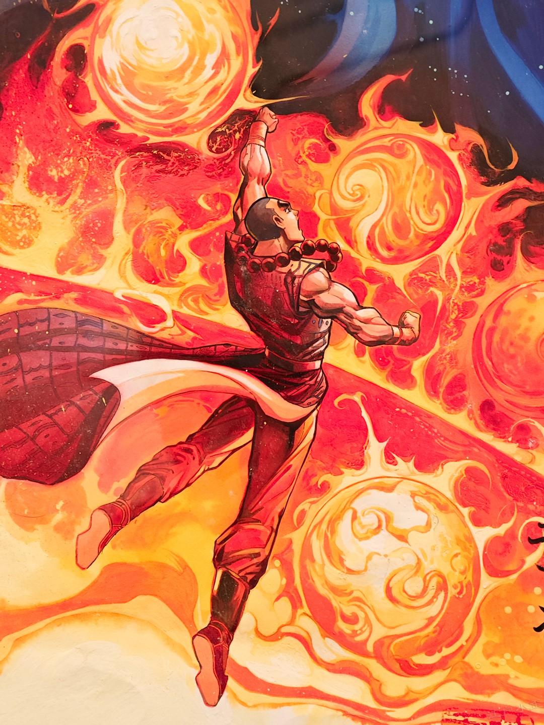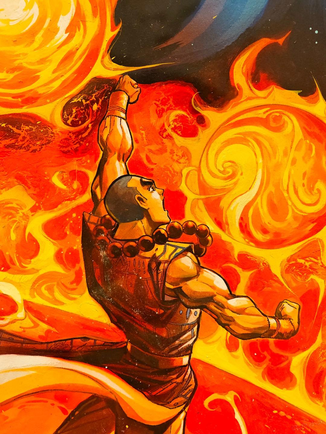 这幅是天龙八部故事第61回《六阳对星移》的封面,香港漫画家黄玉郎绘制,近日我摄于广州美术馆,尺寸44*32cm。小时候我还收集过这套小虎队食品卡,很喜欢天龙八部漫画的造型,还有一些明暗的处理以及色彩表现,这次在广州美术馆看到,感到非常震撼。 只见二位高手对峙,虚竹施展出绝学天山六阳掌(不知为何握拳),好像是站在烈日之上,而慕容复临空飞起,手中聚气,正是他的拿手好戏——斗转星移。整个画面冷暖色对轰,气势浩大,构思奇幻,壮怀激烈。稿子上还能看到画稿上水粉、丙烯的笔触。