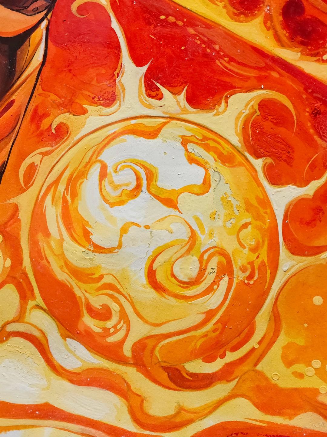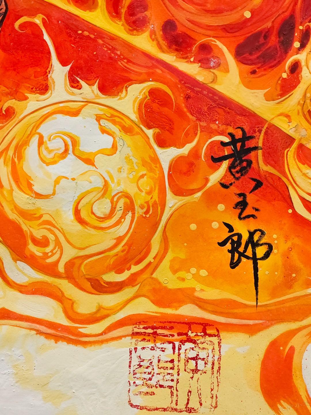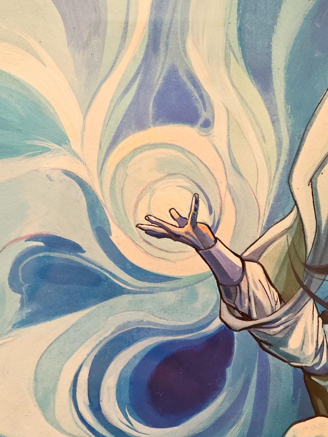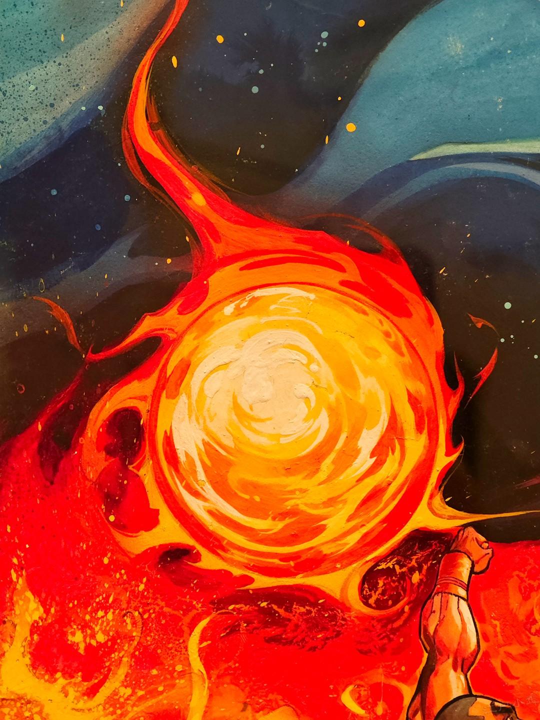 这幅是天龙八部故事第61回《六阳对星移》的封面,香港漫画家黄玉郎绘制,近日我摄于广州美术馆,尺寸44*32cm。小时候我还收集过这套小虎队食品卡,很喜欢天龙八部漫画的造型,还有一些明暗的处理以及色彩表现,这次在广州美术馆看到,感到非常震撼。 只见二位高手对峙,虚竹施展出绝学天山六阳掌(不知为何握拳),好像是站在烈日之上,而慕容复临空飞起,手中聚气,正是他的拿手好戏——斗转星移。整个画面冷暖色对轰,气势浩大,构思奇幻,壮怀激烈。稿子上还能看到画稿上水粉、丙烯的笔触。