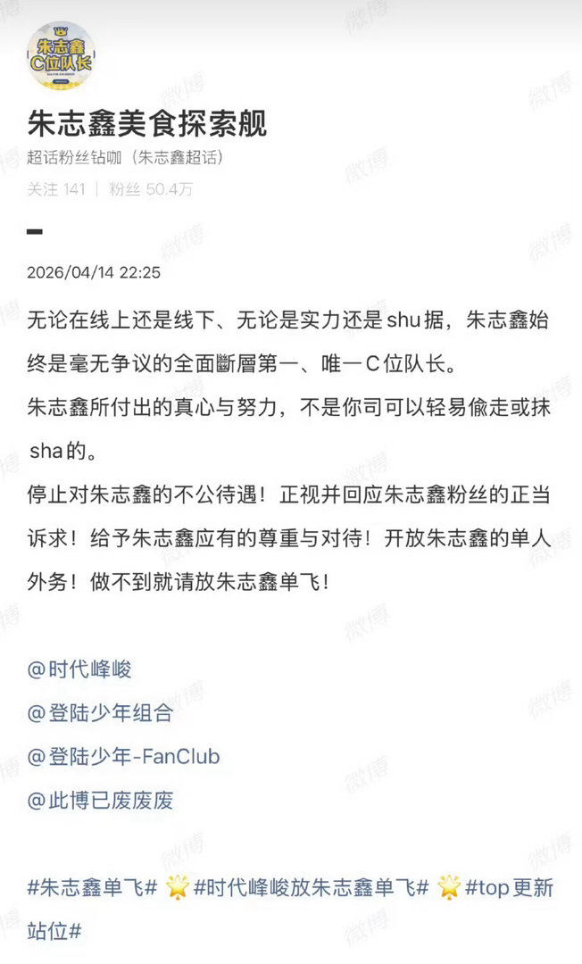 朱志鑫家向时代峰峻提出五点诉求,要求归还C位待遇,开放个人外务。