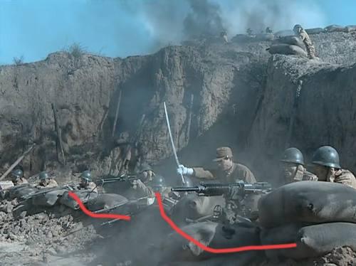 再说布置机枪阵地时,机枪是放在沙袋上稳定还是直接搁地上稳定?导演没见过机枪吧!