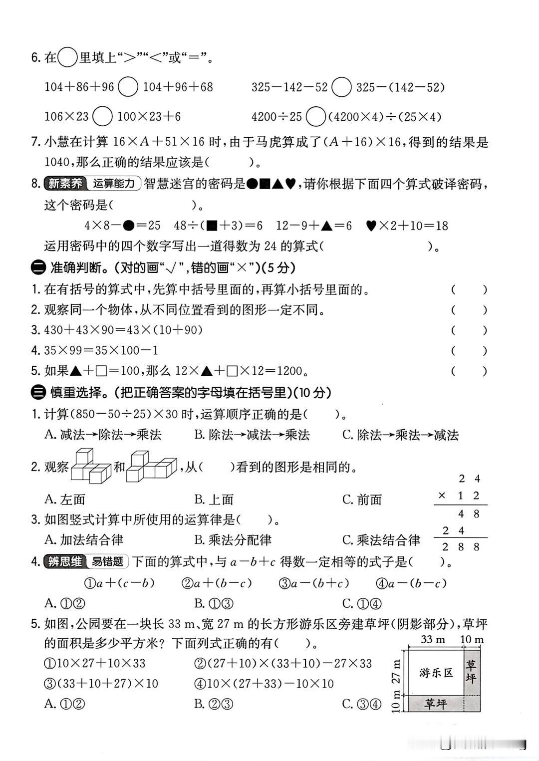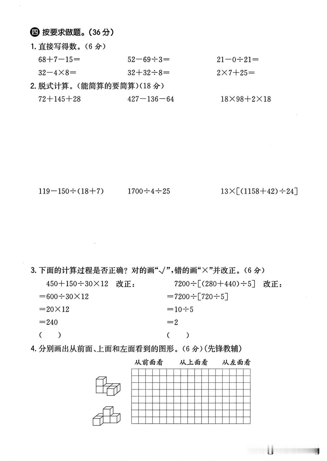 四年级下册数学质量检测卷人教版(第一次月考测试卷)