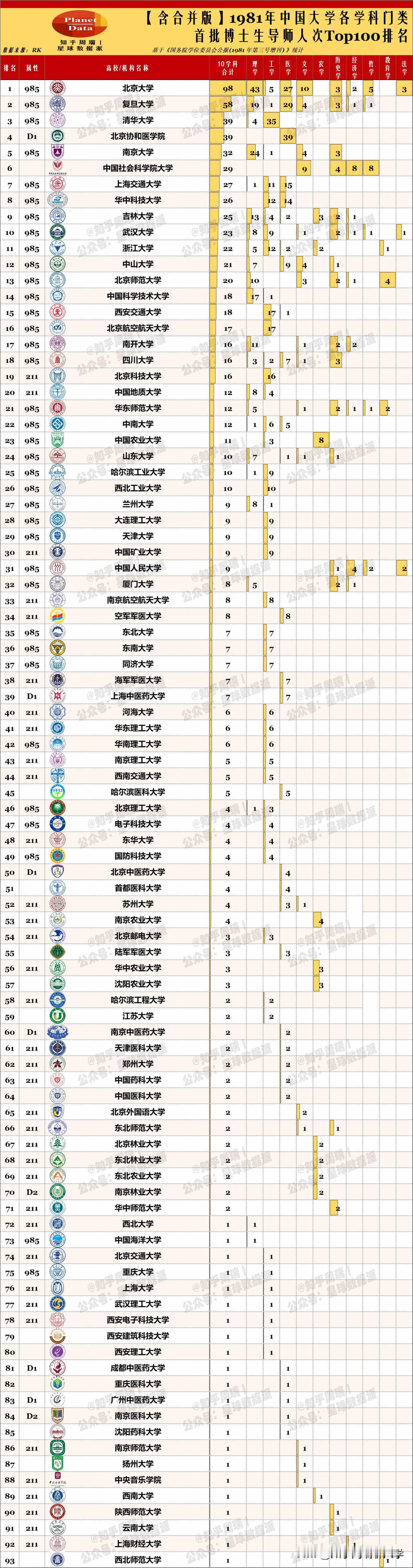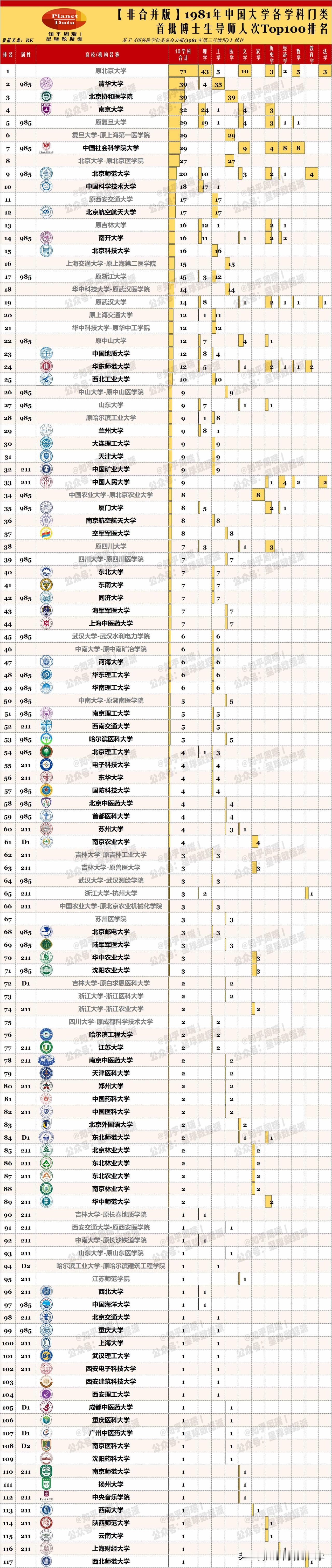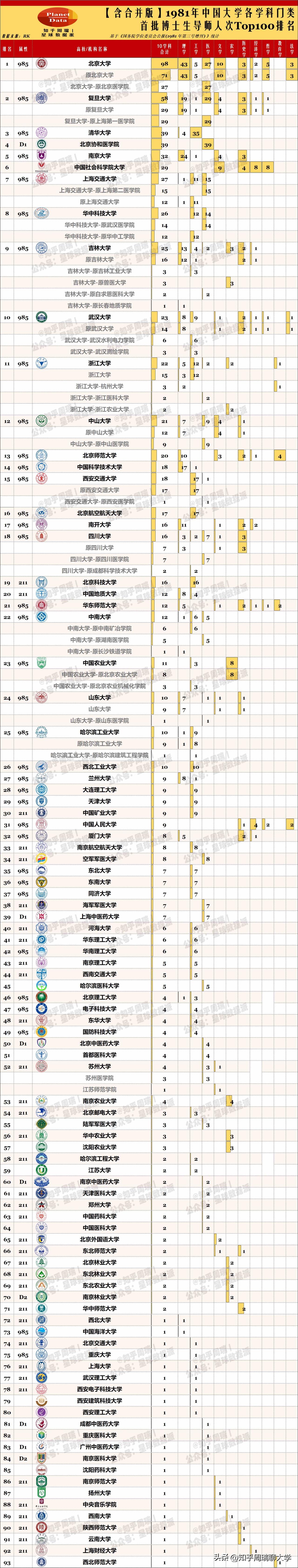 1981年首批博导人数排名,按照目前的院校实体范围追溯排名,北大稳居第一,复旦表现出色,华科、吉大、武大前10。谁是最大赢家?
