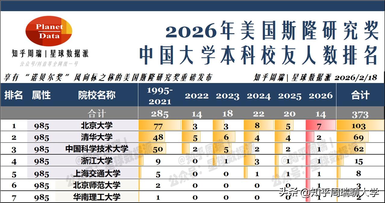 2026诺奖风向标斯隆奖人数排名:北大7人,上交、北师大、华南理工1人上榜!