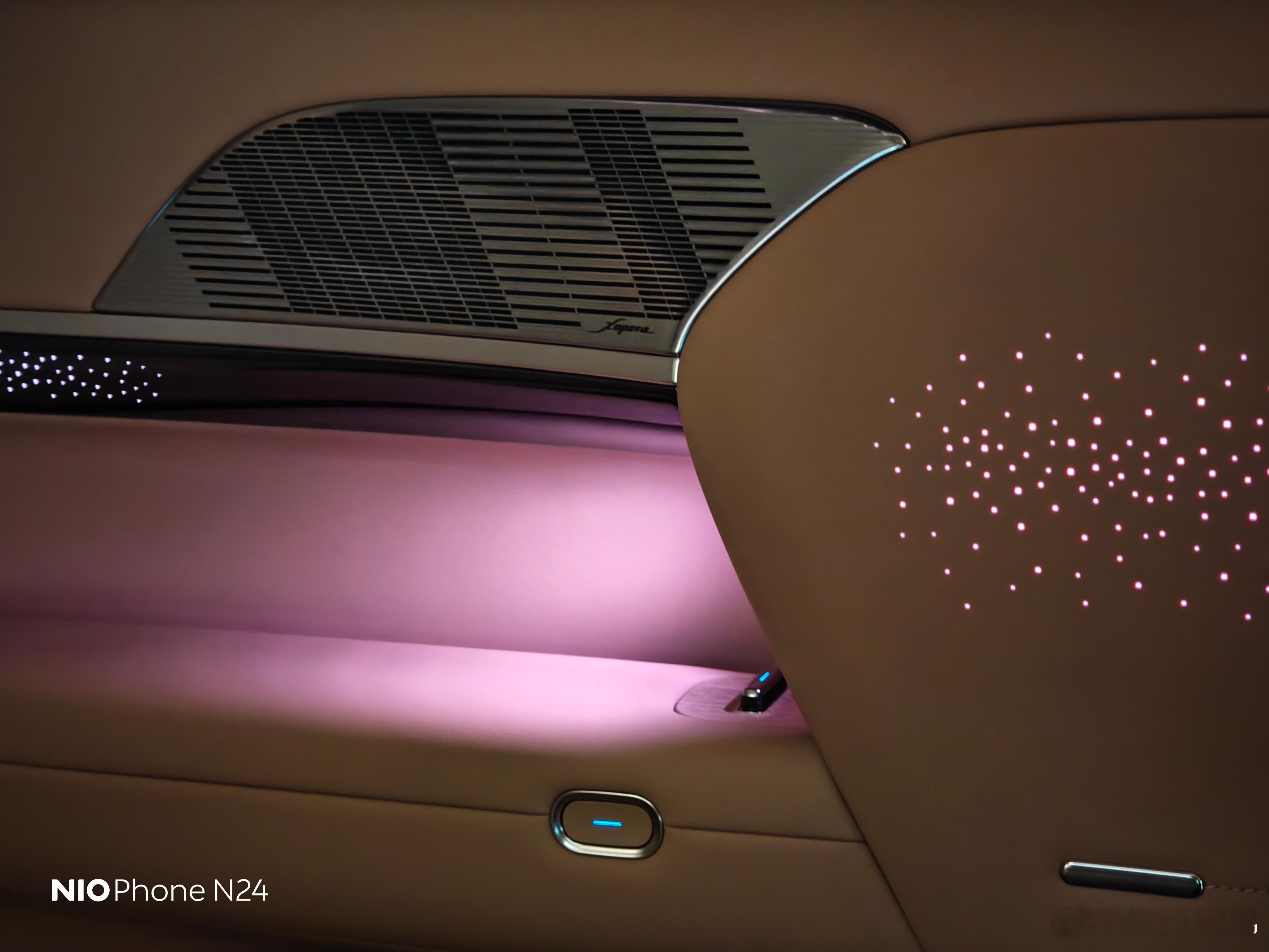 车门内饰版使用了高亮金属罩,下面还做了个小空间,打入氛围灯,配合星光主题感觉不错,有情绪价值。