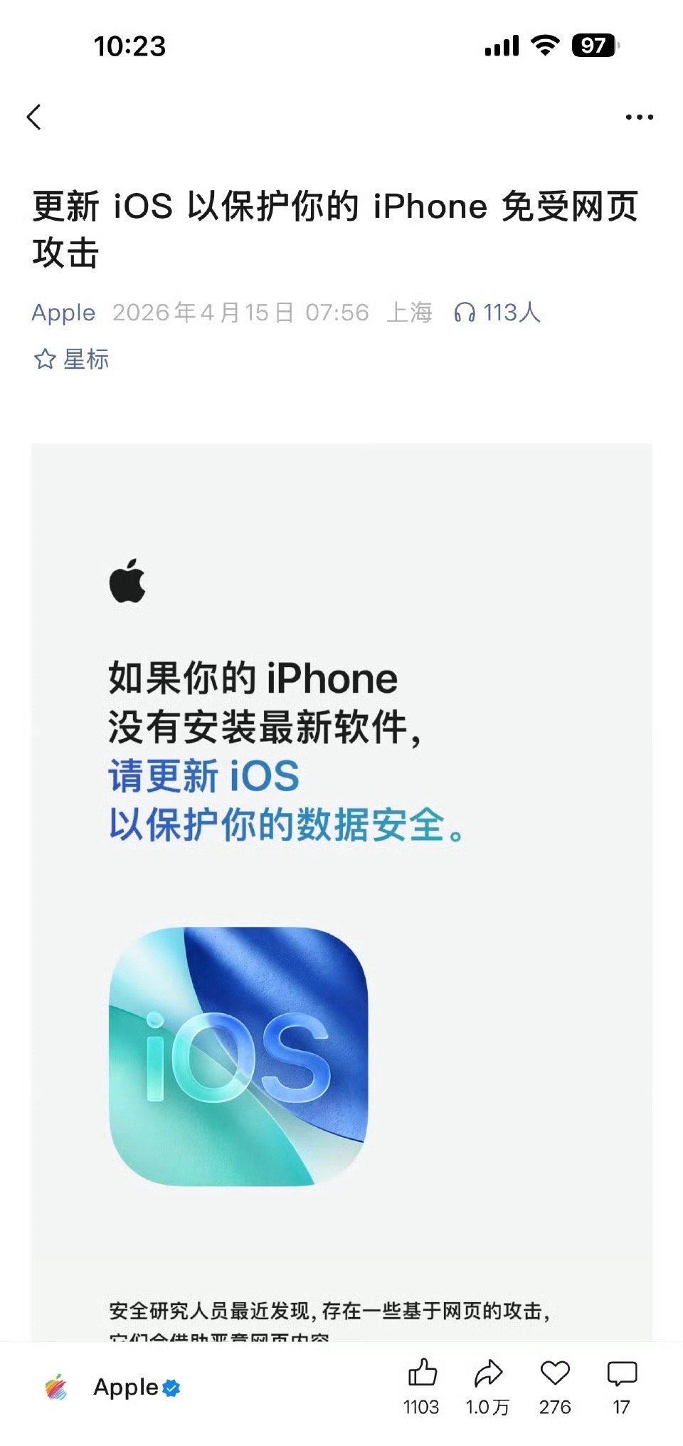 苹果官方发文提醒苹果提醒大家了,手机系统要是很久没更,就去检查一下,能升级就升级,对手机也更安全点。