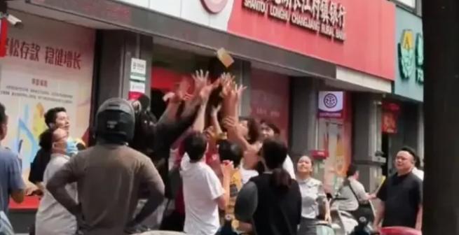 4月14日汕头星湖城,一位大妈从高层阳台往下撒500、1000面值的港币,钞票漫天飞,楼下瞬间围满了人。外卖小哥、路过的阿姨、街坊邻居全蹲在地上捡,你争我抢的,场面热闹得不行。