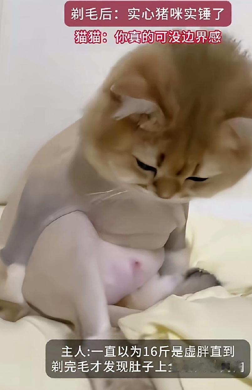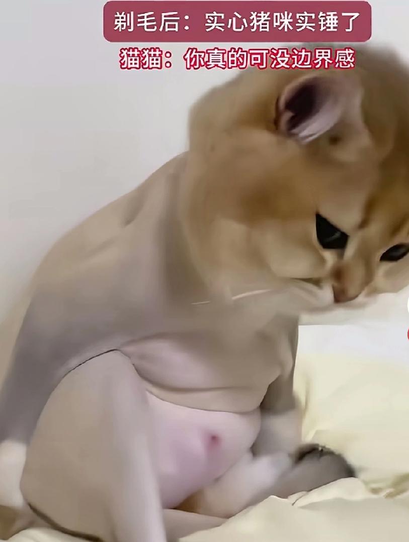 为了验证自己的想法,主人特意带豆豆去剃了毛。原本蓬松的毛发被剃掉后,豆豆的真实身材一下子暴露出来。身上的肉没有了毛发的支撑,软乎乎地塌了下来,肚子圆鼓鼓,四肢也肉感十足,整只猫肥嘟嘟的,看着格外敦实。