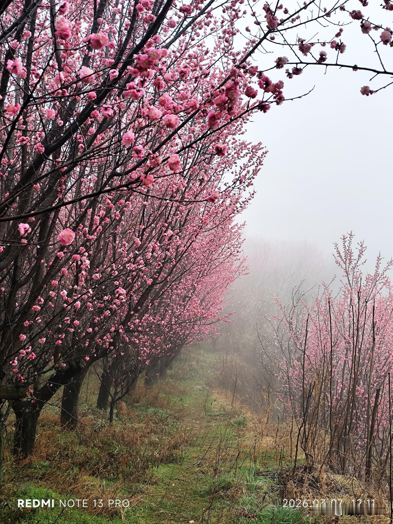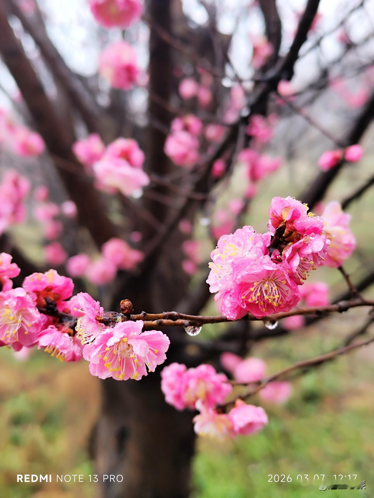 脚下绿色的草地,和雨雾的晕染,似有了朦胧的仙境。雨水顺着花枝滴落,又像是花开的温柔细语,混着淡淡的梅香,清冽又治愈~