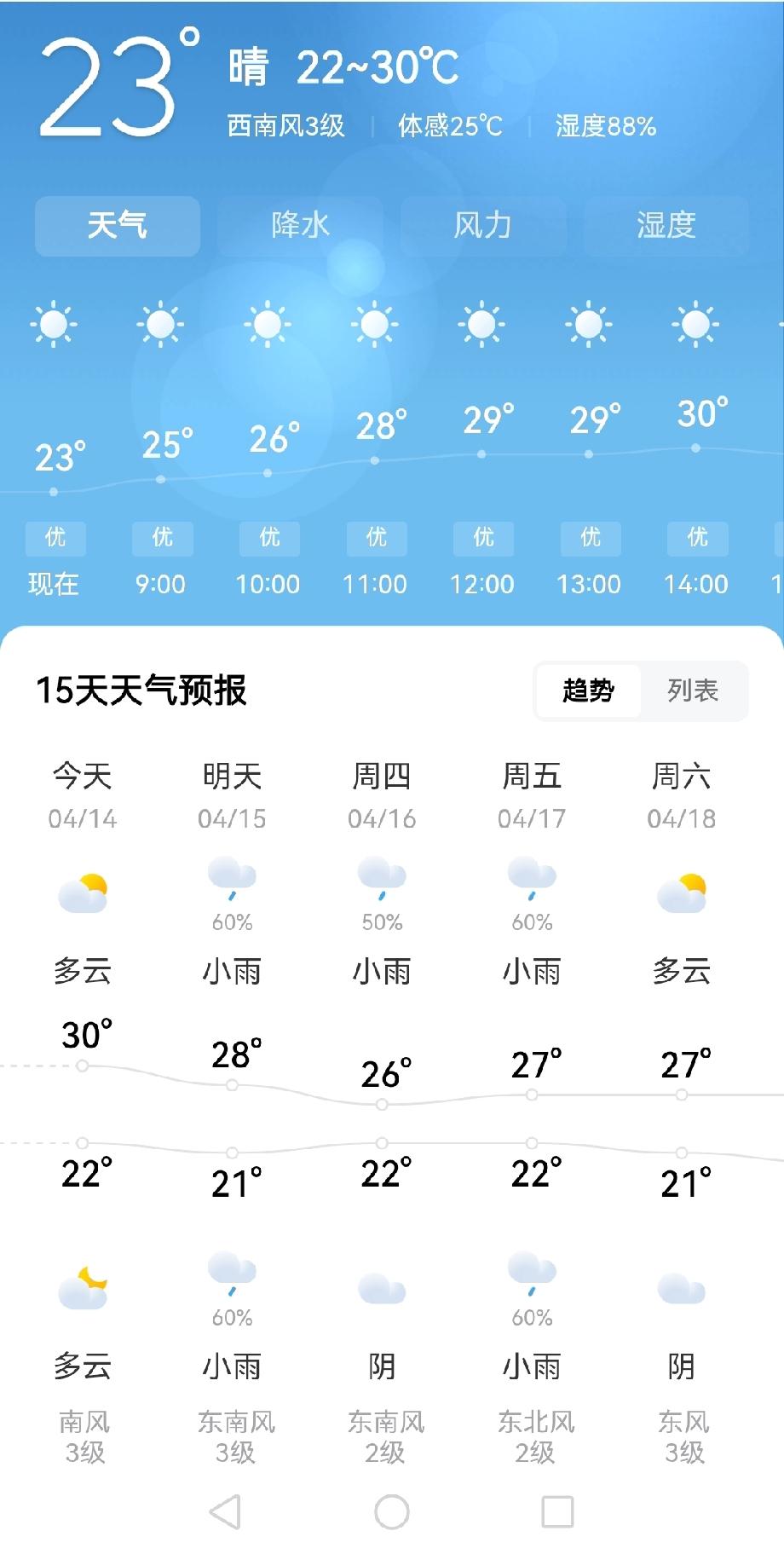 最高30°,夏天无疑,多云,其实就是闷热的天气,接下来预报有雨,望这闷热天气可以