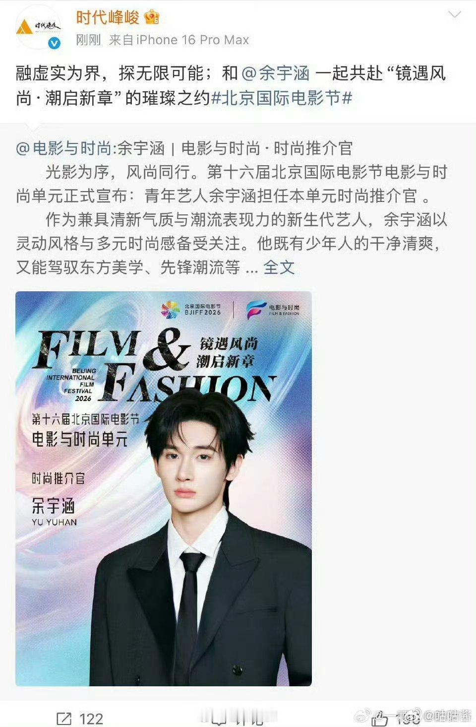 时代峰峻宣传余宇涵北京国际电影节余宇涵北京国际电影节推介官 时代峰峻发博宣传余宇