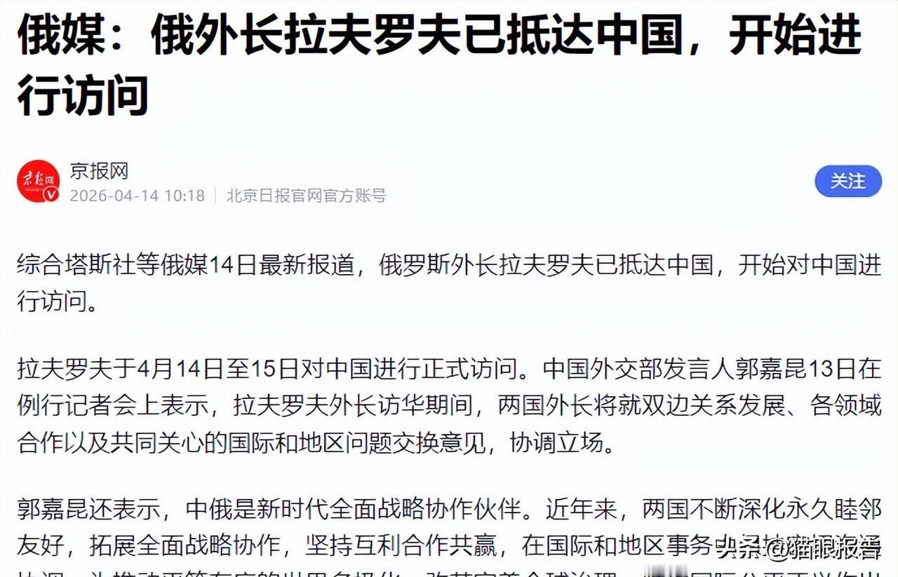 4月14日,拉夫罗夫飞到北京。他亲口说了,普京5月中旬来。而特朗普的访华时间定在5月14日。一个刚走,一个就来。