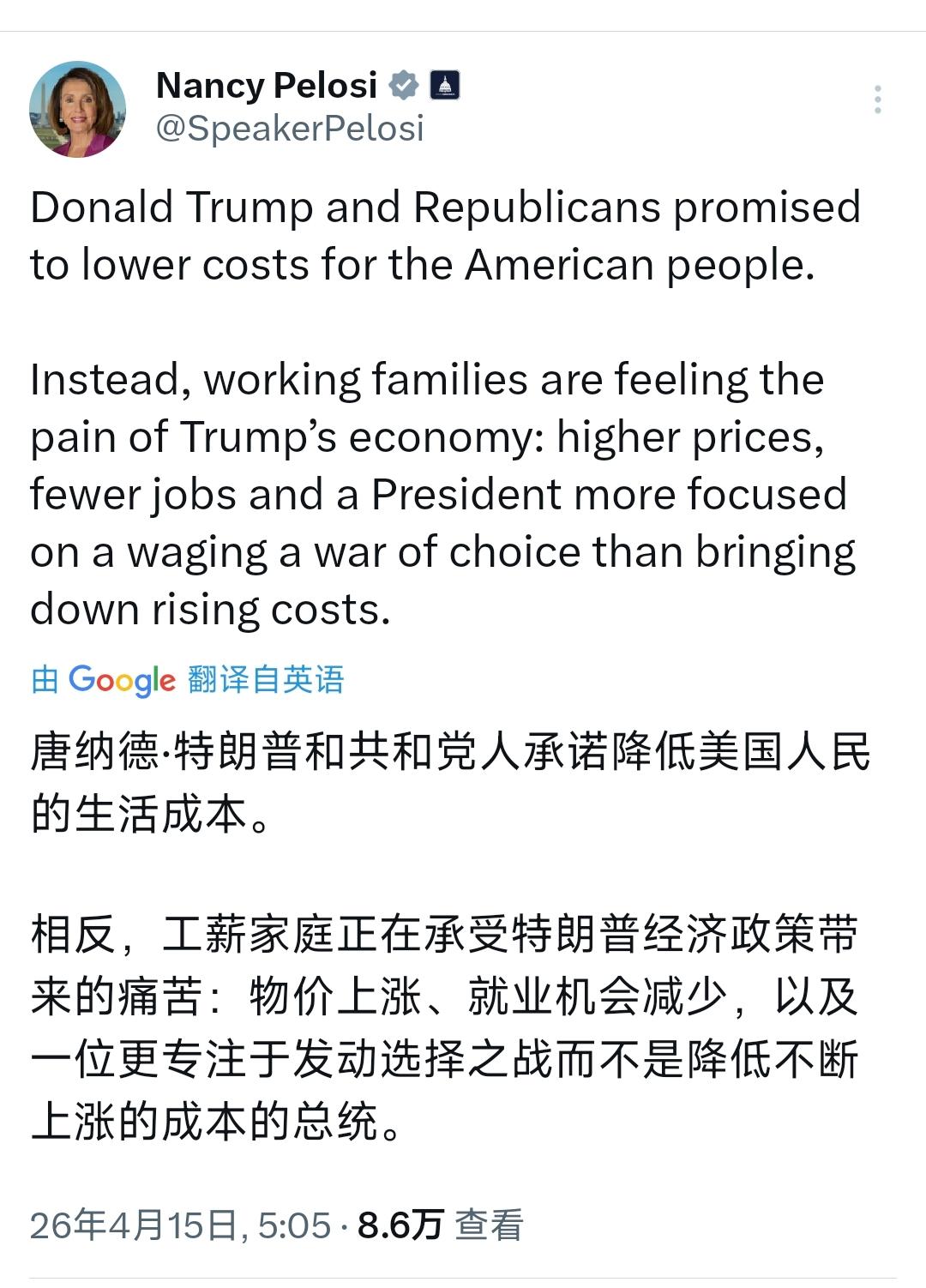 当地时间4月14日(北京时间4月15日),美国前众议院议长南希・佩洛西通过社交媒体发表评论,对现任总统特朗普的经济施政提出批评。她认为,特朗普政府与共和党此前关于降低美国民众生活成本的承诺未能兑现,工薪阶层家庭正经历物价上涨和就业机会减少的负面影响,且特朗普将更多注意力集中在社会议题的政治斗争上,而非应对通胀压力。
