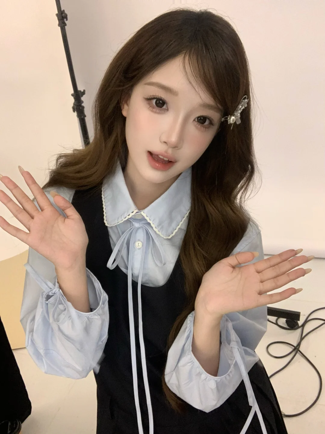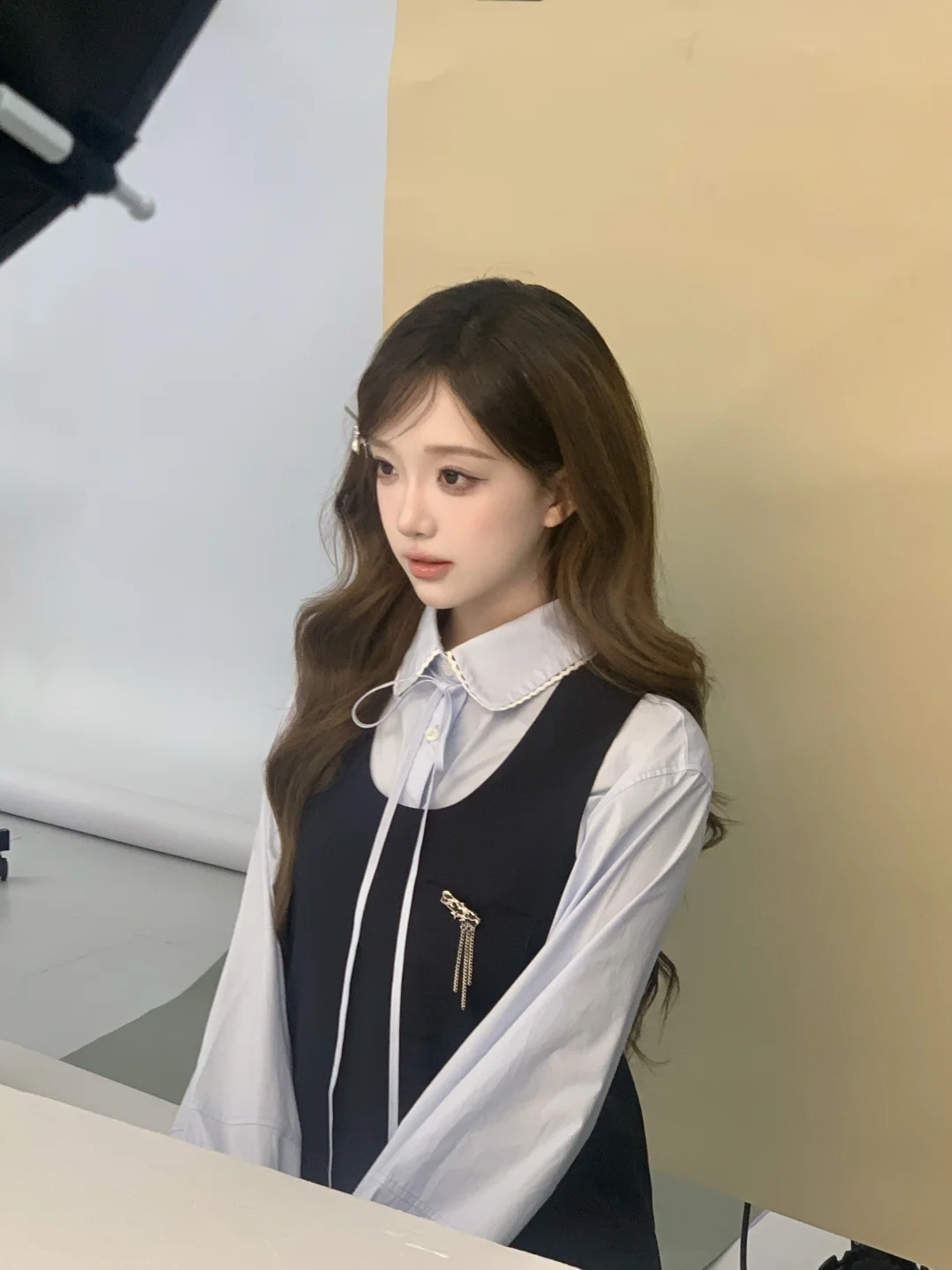 她会说:“头往左偏一点点”“眼神往右看,对,定住”