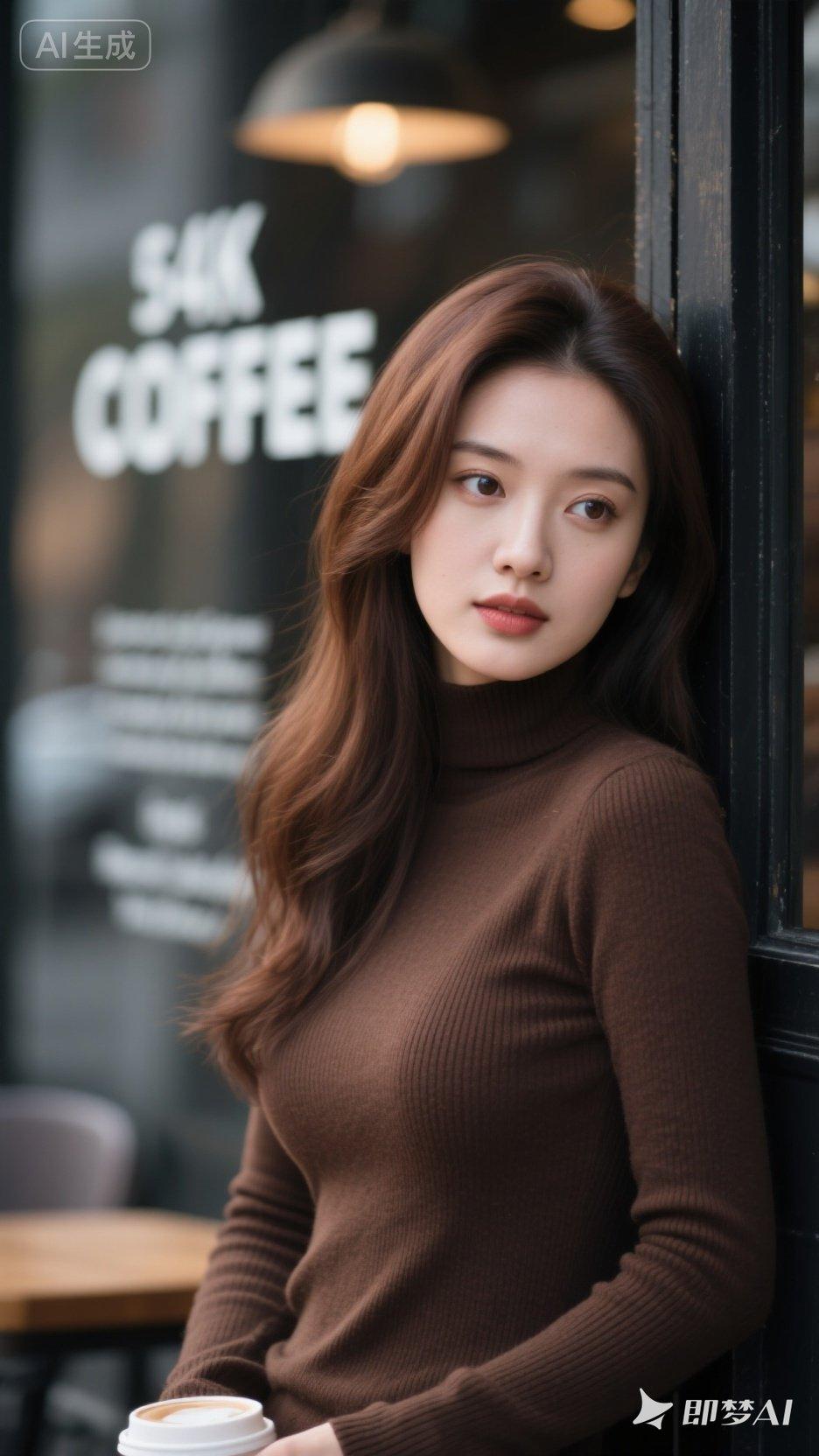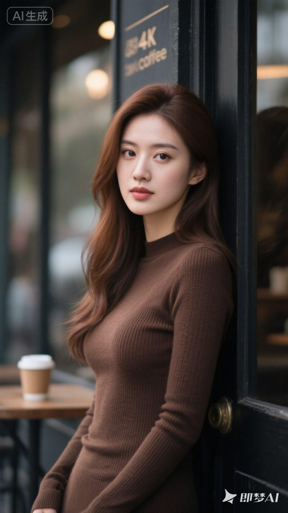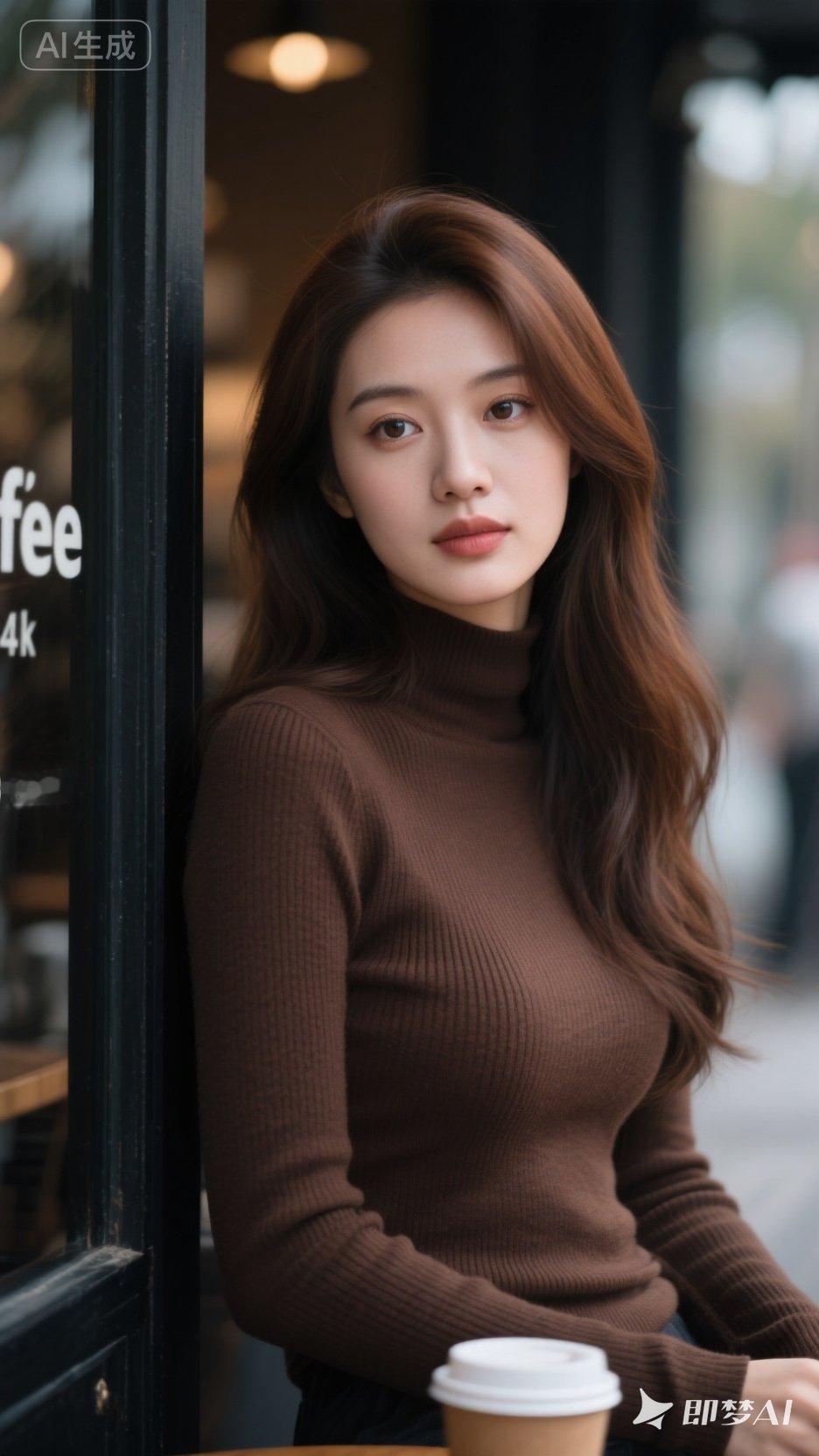 优雅咖啡馆里的迷人少女,温暖色调的穿搭,尽显都市时尚感。