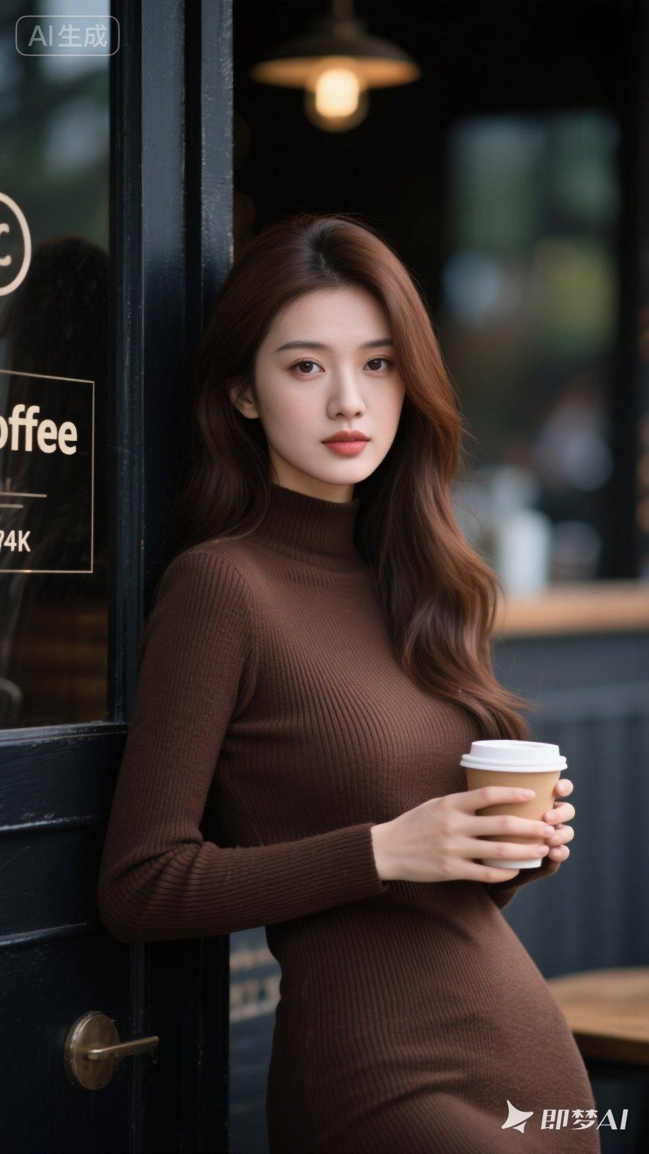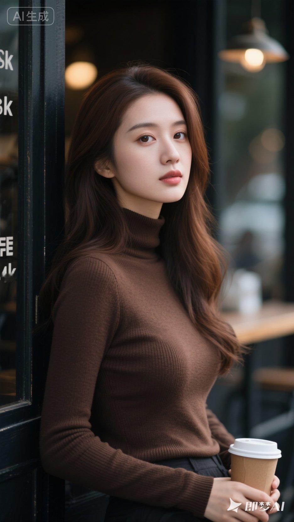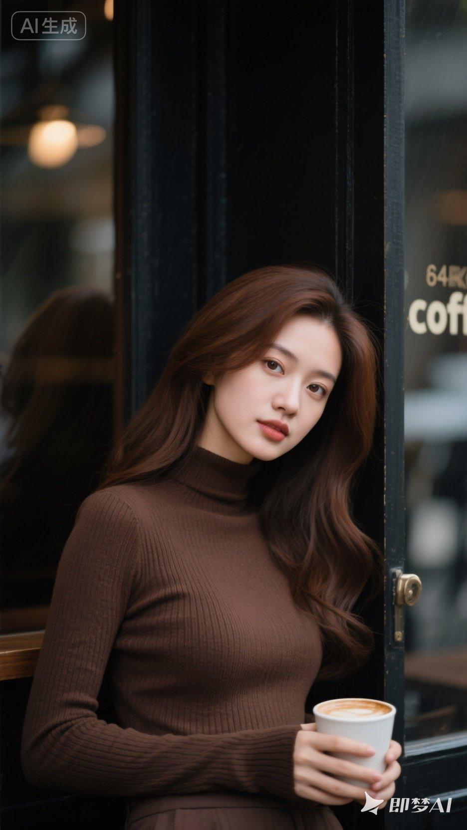 优雅咖啡馆里的迷人少女,温暖色调的穿搭,尽显都市时尚感。