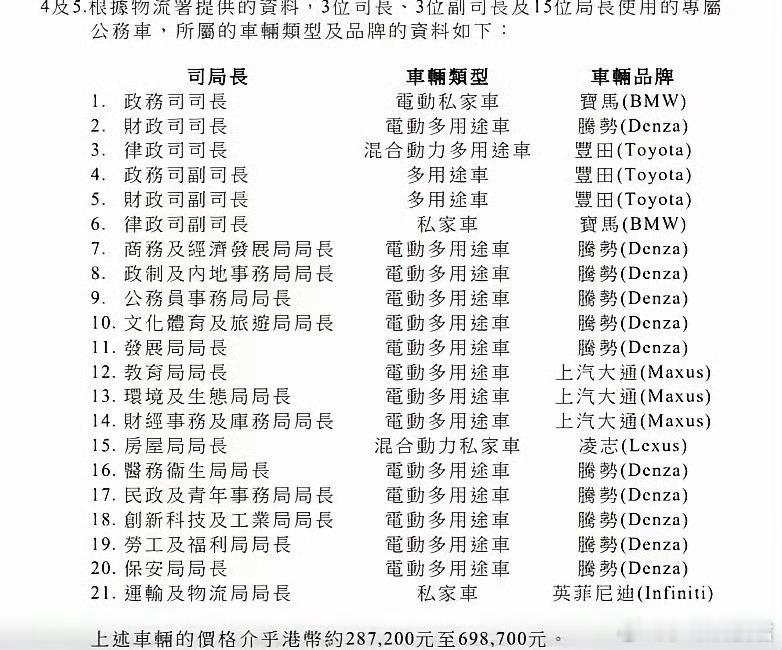 香港21名司局长座驾公开,其中11位的领导座驾是腾势汽车,其他品牌有宝马、丰田、上汽大通、凌志和英菲尼迪。