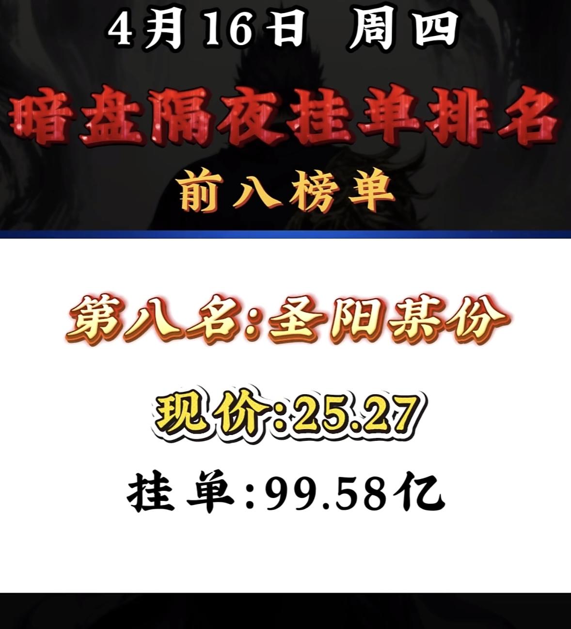暗盘隔夜挂单榜前八名揭晓啦!圣阳股份这次位列第八,现价25.27,挂单量99.58亿。看看之前的情况,4月15日圣阳股份还是第一名,当时现价22.97,挂单50.63亿。第二名博云新材,4月15日现价13.29,挂单47.94亿。再往前4月14日,圣阳股份也是榜首,现价20.88,挂单52.08亿。这股价和挂单量一直在变,股市真是风云莫测啊,不知道圣阳股份之后还能不能重回榜首,咱就接着瞧吧。