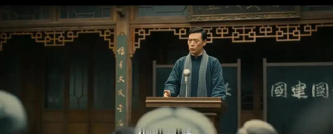 张桐演的谢语峰在台上讲抗战,台下坐着罗祖良和他女朋友,旁边站着小月。