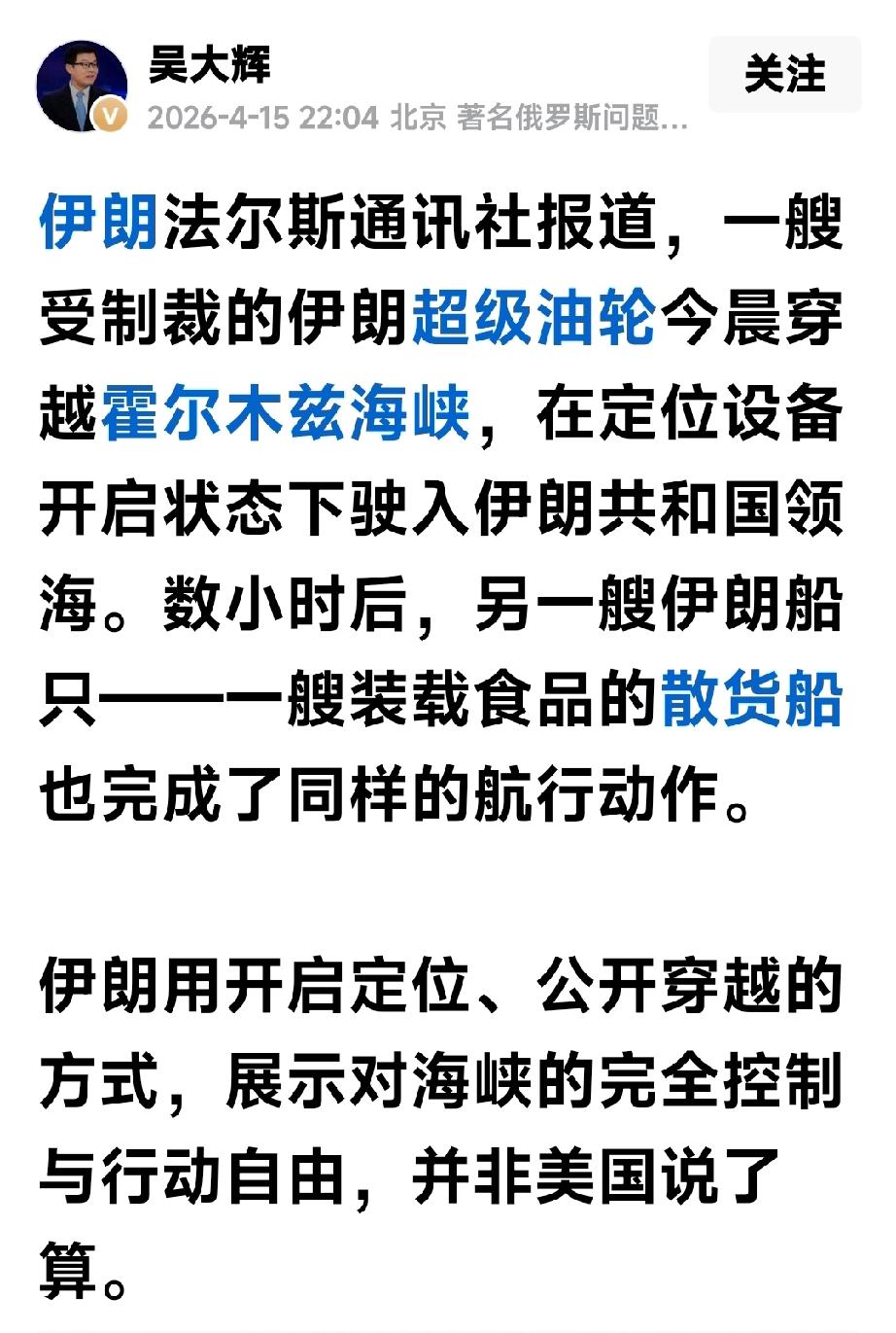 这让人想到我国著名的俄罗斯问题专家,清华大学国际关系学系教授吴大辉先生报道的情况应该是属实的,应该确实有伊朗船舶公开进入霍尔木兹海峡。