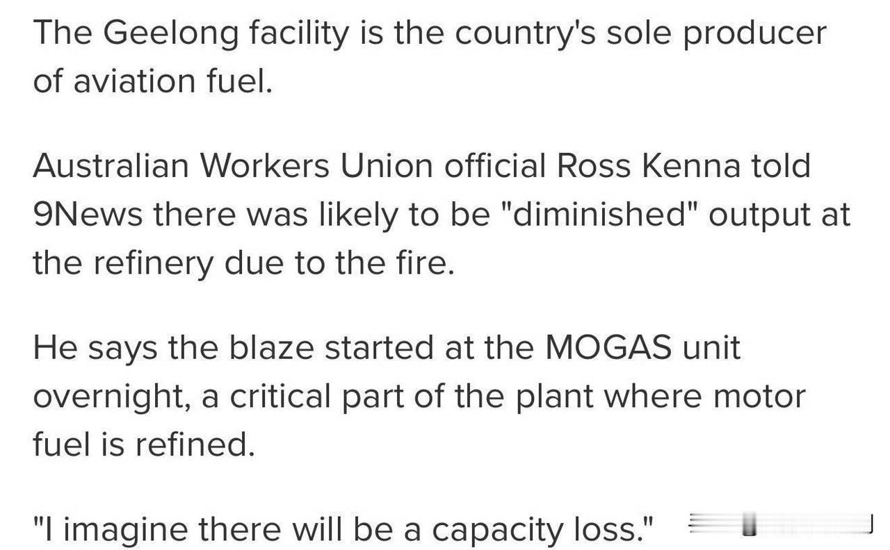 该炼油厂为澳大利亚生产10%的燃油,主要负责炼化航空燃油,预计将对澳大利亚航空业造成直接影响。