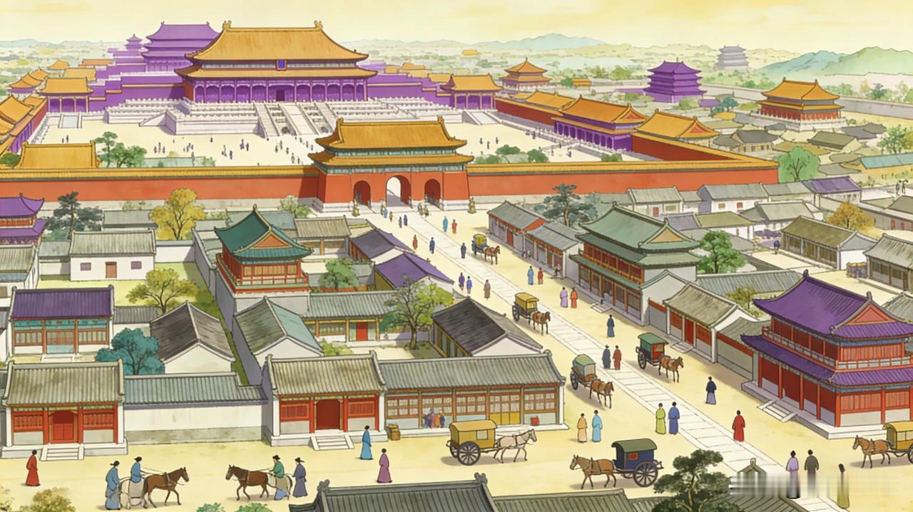 此画为明代佚名画家所作,以极致细腻的笔触,绘出了明中后期北京最真实、最热闹的盛世风貌。画卷全长约21.8米,从郊外田畴、卢沟桥畔的往来行旅,到城内纵横交错的街巷、热闹非凡的集市摊贩、鳞次栉比的商铺门店,再到巍峨耸立的城楼、车马络绎的官道,最终延伸至气势恢宏的宫阙城楼,一路徐徐铺展、层层递进,完整复刻了大明都城的全景风貌,堪称明代北京的“全景纪录片”。