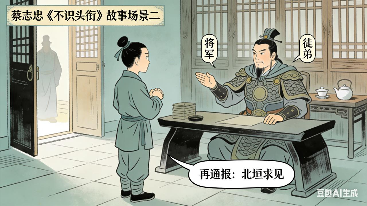 徒弟告诉大将军:“师父请你回去,因为他不认识什么大将军。”