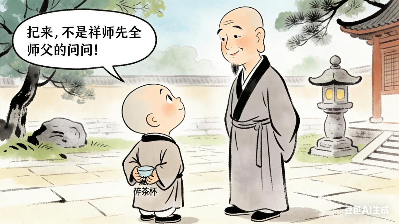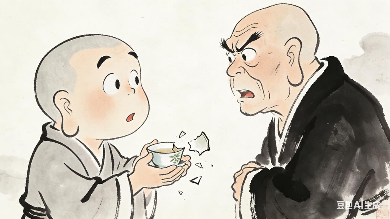 一休从身后拿出摔碎的茶杯,对师傅说:“师傅,您的茶杯死期到了。”说完就一溜烟跑了,只留下满脸错愕的师傅。