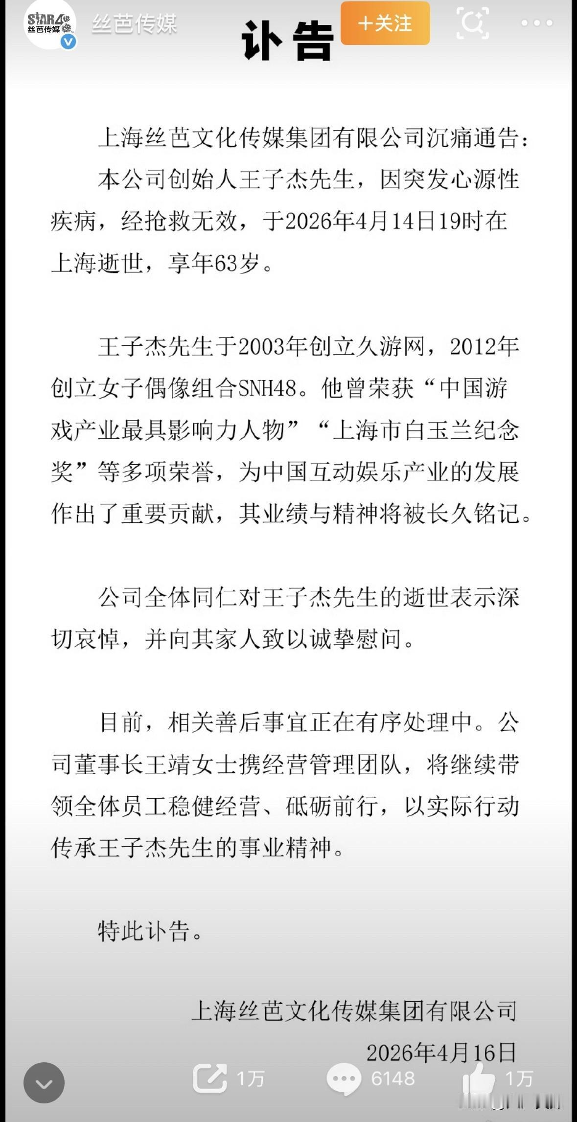 4月16日,丝芭传媒发布讣告,公司创始人王子杰因突发心源性疾病于上海逝世,享年63岁。消息传来,令熟悉中国偶像产业的人们唏嘘不已。
