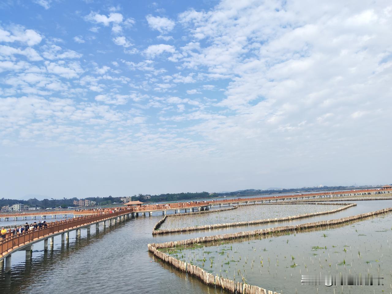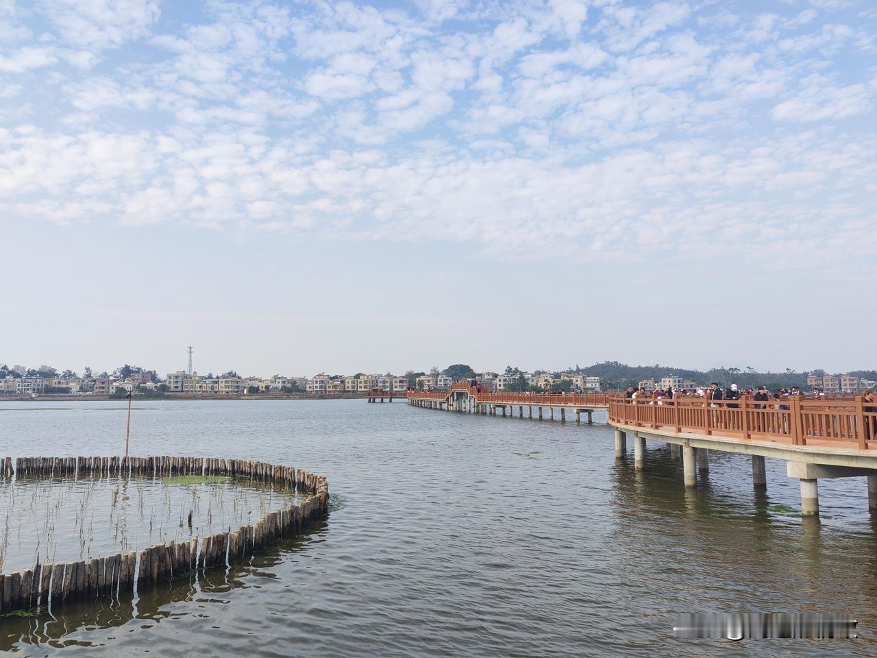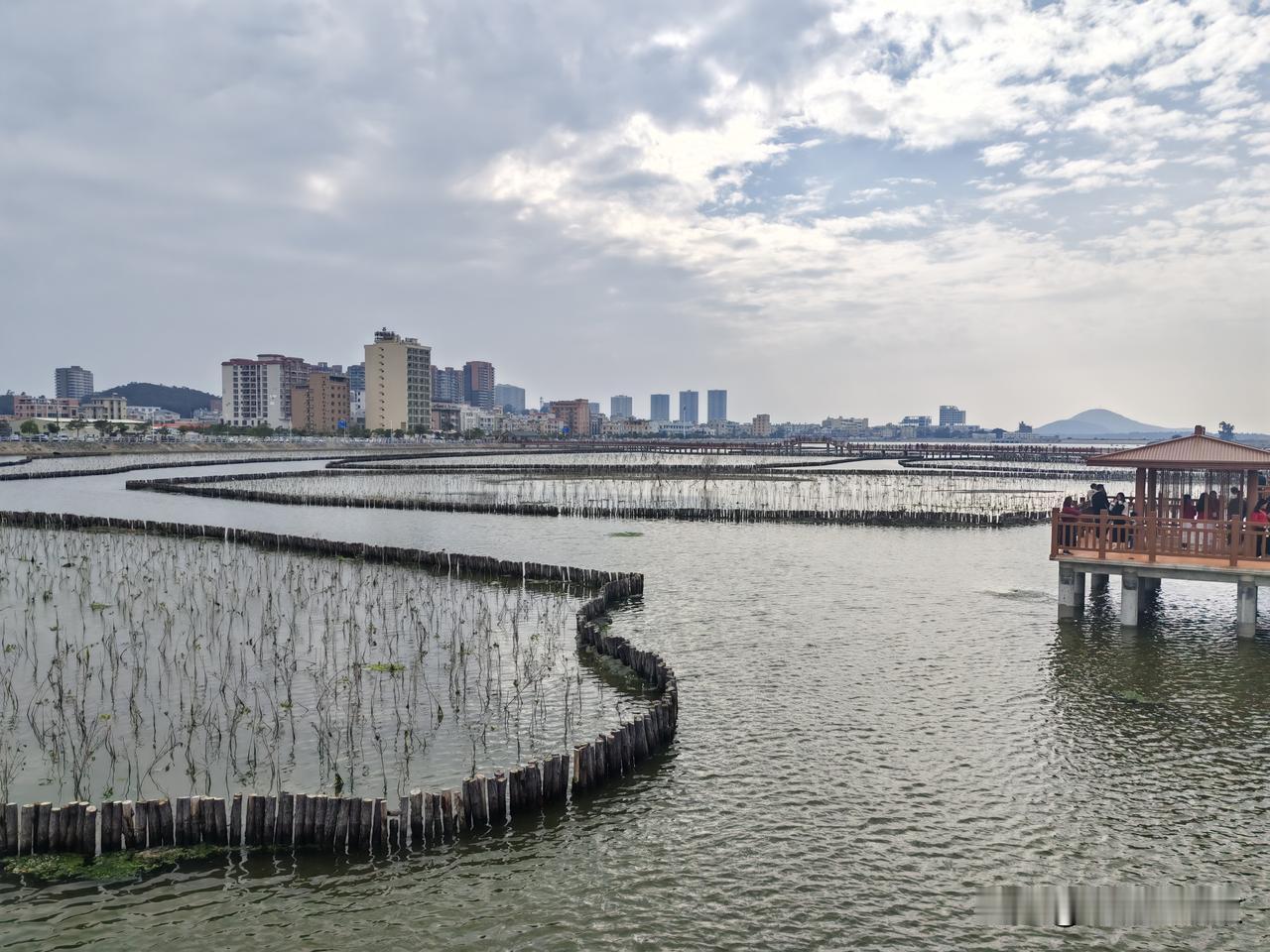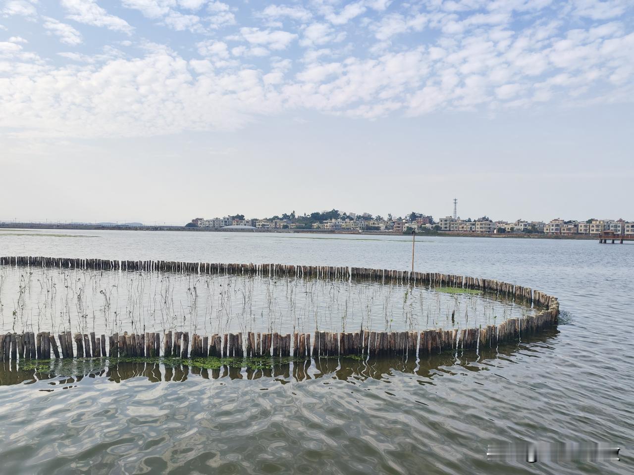 海仔湖的水泥栈道连接着沙扒镇和渡头村,工程颇为浩大。焦黄色的栈道曲折蜿蜒,将海面分割成众多小块,恰似一片片水田。内海水面上生长着一圈圈的红树林。刚成活的红树林及其围栏,把如镜的海面划分成形状各异的区域,美不胜收!
