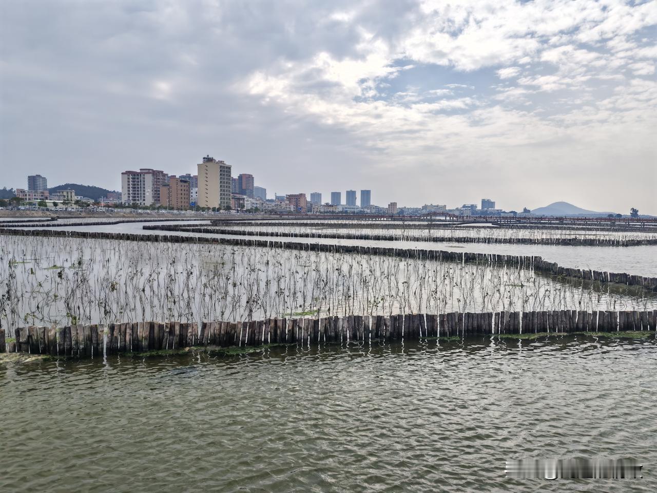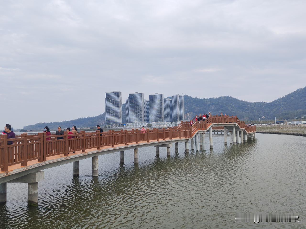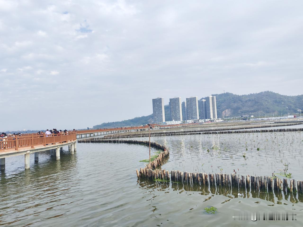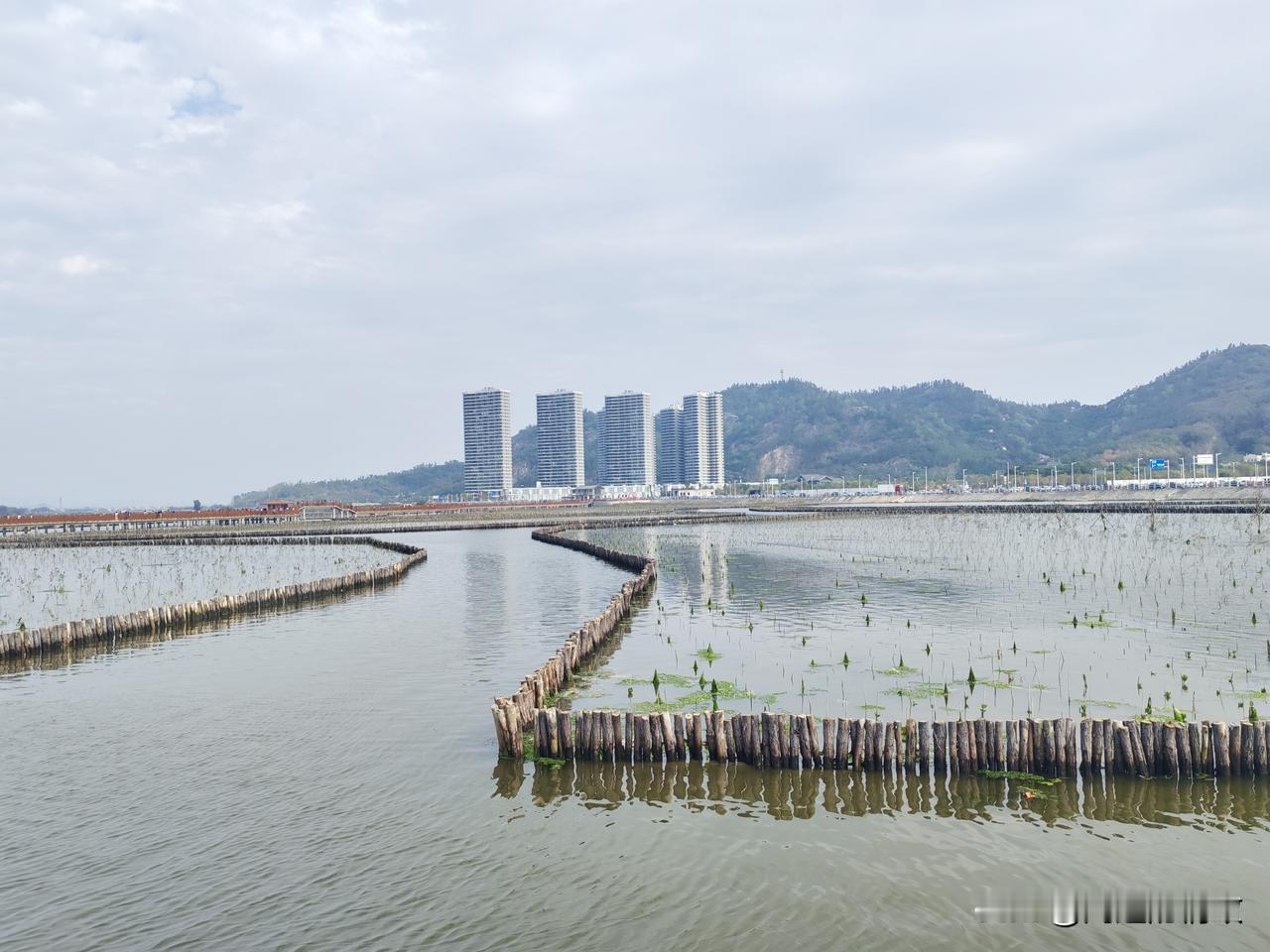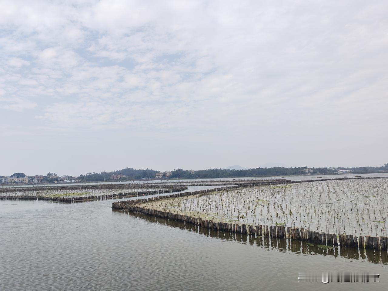 海仔湖的水泥栈道连接着沙扒镇和渡头村,工程颇为浩大。焦黄色的栈道曲折蜿蜒,将海面分割成众多小块,恰似一片片水田。内海水面上生长着一圈圈的红树林。刚成活的红树林及其围栏,把如镜的海面划分成形状各异的区域,美不胜收!