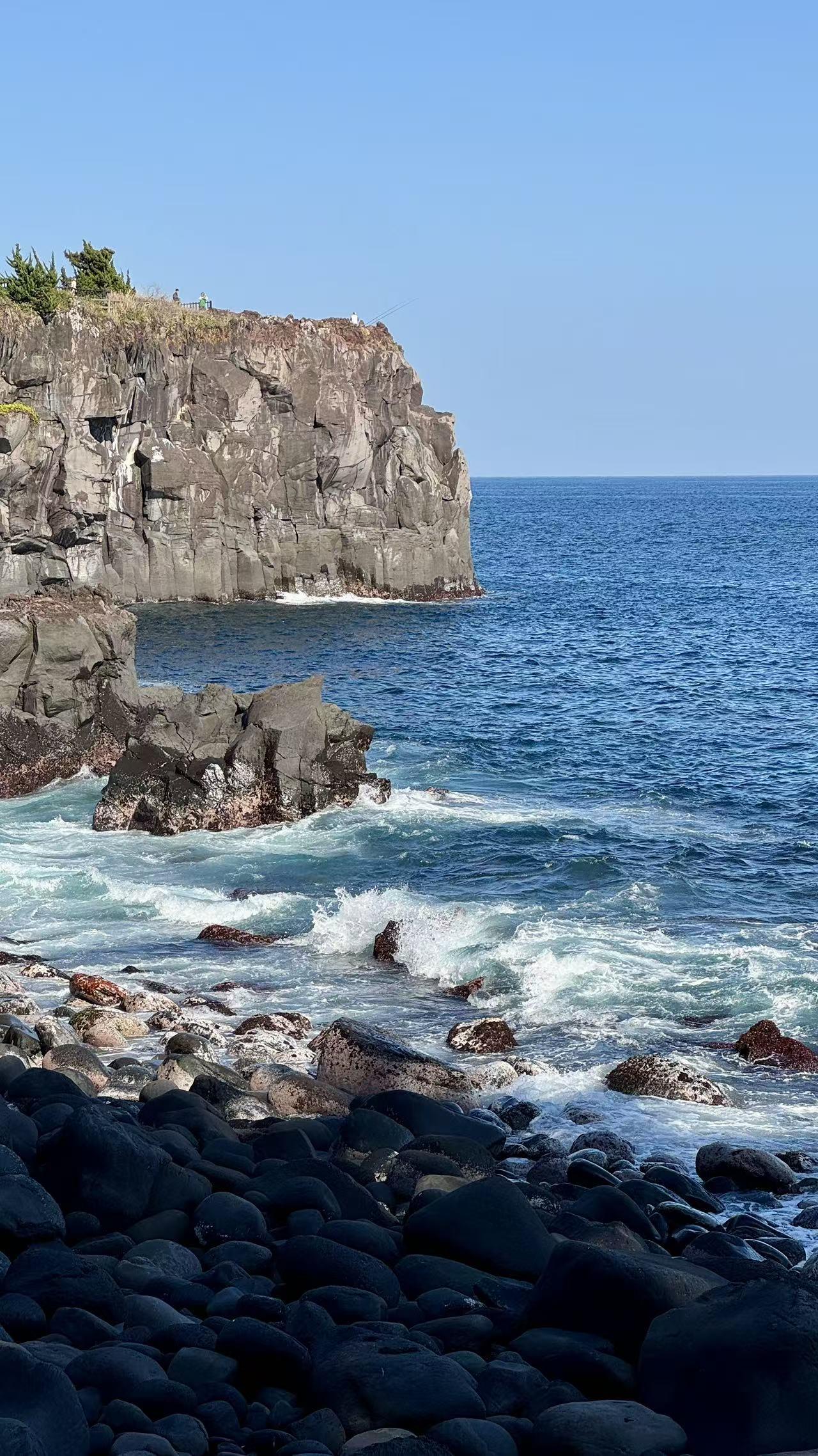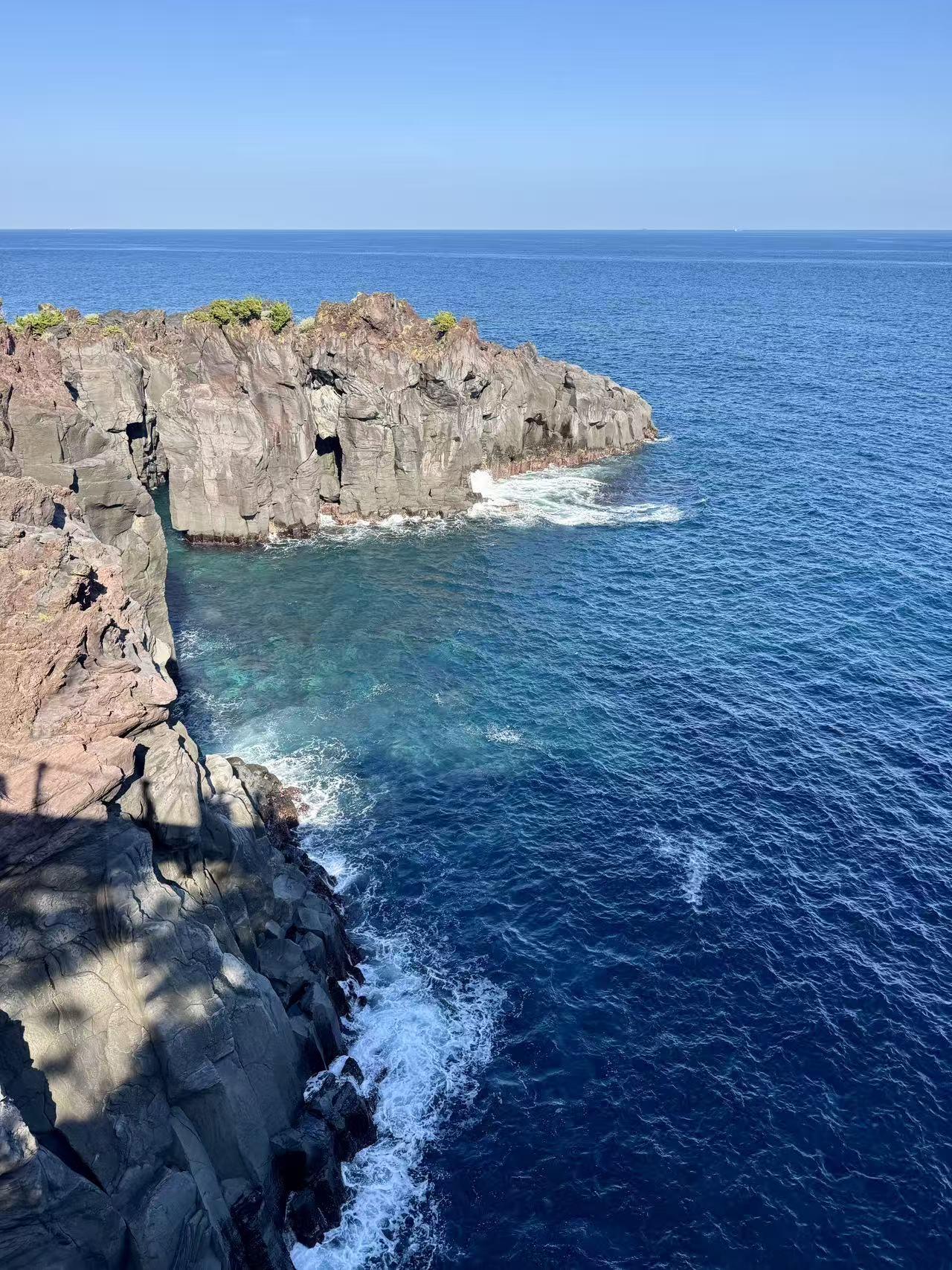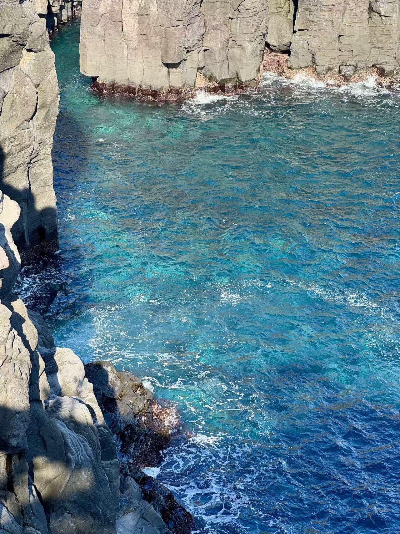 第5-8张照片,是伊豆海岸的壮阔与清透。城崎海岸的玄武岩断崖,是千万年海浪与火山共同雕刻的杰作。黝黑的礁石被海浪反复冲刷,白浪一次次拍打着崖壁,发出震耳的轰鸣,是大海最有力的呼吸。而崖下的海水,是层次分明的蓝:近岸是清透的绿松石色,能看见水下的礁石纹理;远海是深邃的宝蓝色,与蓝天连成一片。站在崖边,才能真正体会到伊豆“山海之国”的震撼,火山的刚与海水的柔,在这里撞出最动人的风景。